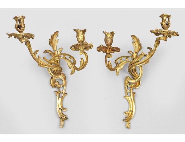 Gegenstücke. 2-flg.; Bronze, vergoldet. Schmale, durchbrochen gearbeitete Wandschilder, in stark geschwungene Leuchterarme mit vasenförmigen Tüllen übergehend. Bohrung für Elektrifizierung. H. 39 cm.