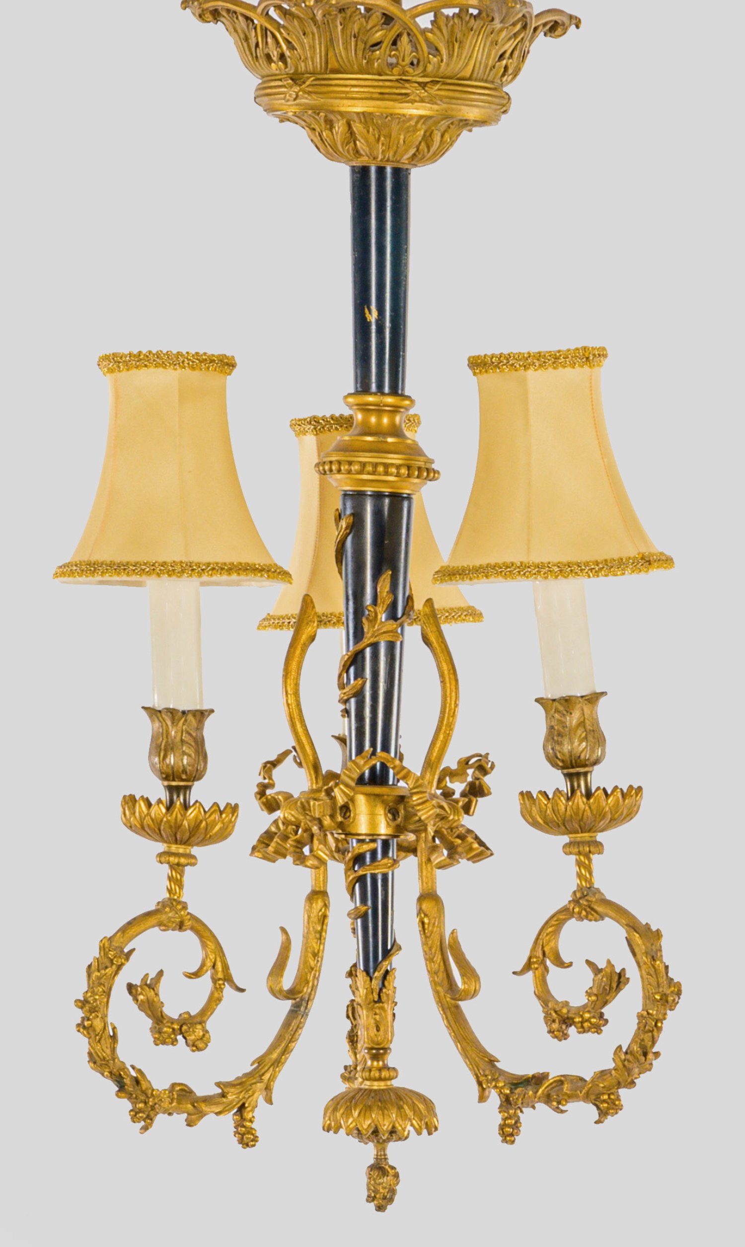 3-flg.; Bronze, vergoldet bzw. blauschwarz lackiert. Konischer Balusterschaft, umwunden von Blattwerk. Davon ausgehend stark geschwungene Leuchterarme aus eingerollten Voluten mit vasenförmigen Tüllen. Dekorative Lampenschirme. Elektrifiziert. H. 72 cm. D. 32 cm.