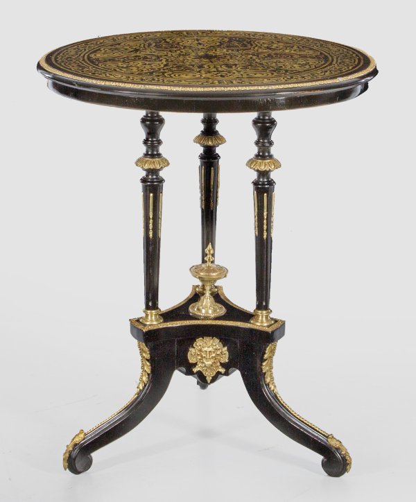Holz, ebonisiert sowie reiche Marketerie aus ornamentiertem Messing in sog. Boulle-Technik. Über volutenartig geschwungenen Beinen, dreiseitig konkav eingezogene Sockelplatte mit Vasenbekrönung. Oberhalb davon ausgehend mehrfach gegliederte, kannelierte Balusterbeine als Träger für bombierte Zarge und runde Deckplatte mit reichem Volutendekor. H. 73 cm. D. 63 cm.
