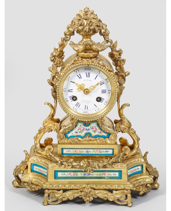 Bronze, vergoldet sowie polychrom gestaltete Porzellanplaketten. Balusterförmiger Korpus, flankiert von Rocaillespangen auf profilgerahmtem Podestsockel und Volutenfüßen. Schauseitig eingelassene Plaketten mit Blütendekor, teilw. besch.; Vasenförmiger oberer Abschluss sowie Bekrönung in Form eines schnäbelnden Taubenpaares mit Nest. Verglastes Emailzifferblatt, bez. Sarazin aus Nègre. Pendulenwerk mit Pendelfeder sowie Halbstundenschlag auf Glocke. H. 34,5 cm. 27 cm x 13 cm.