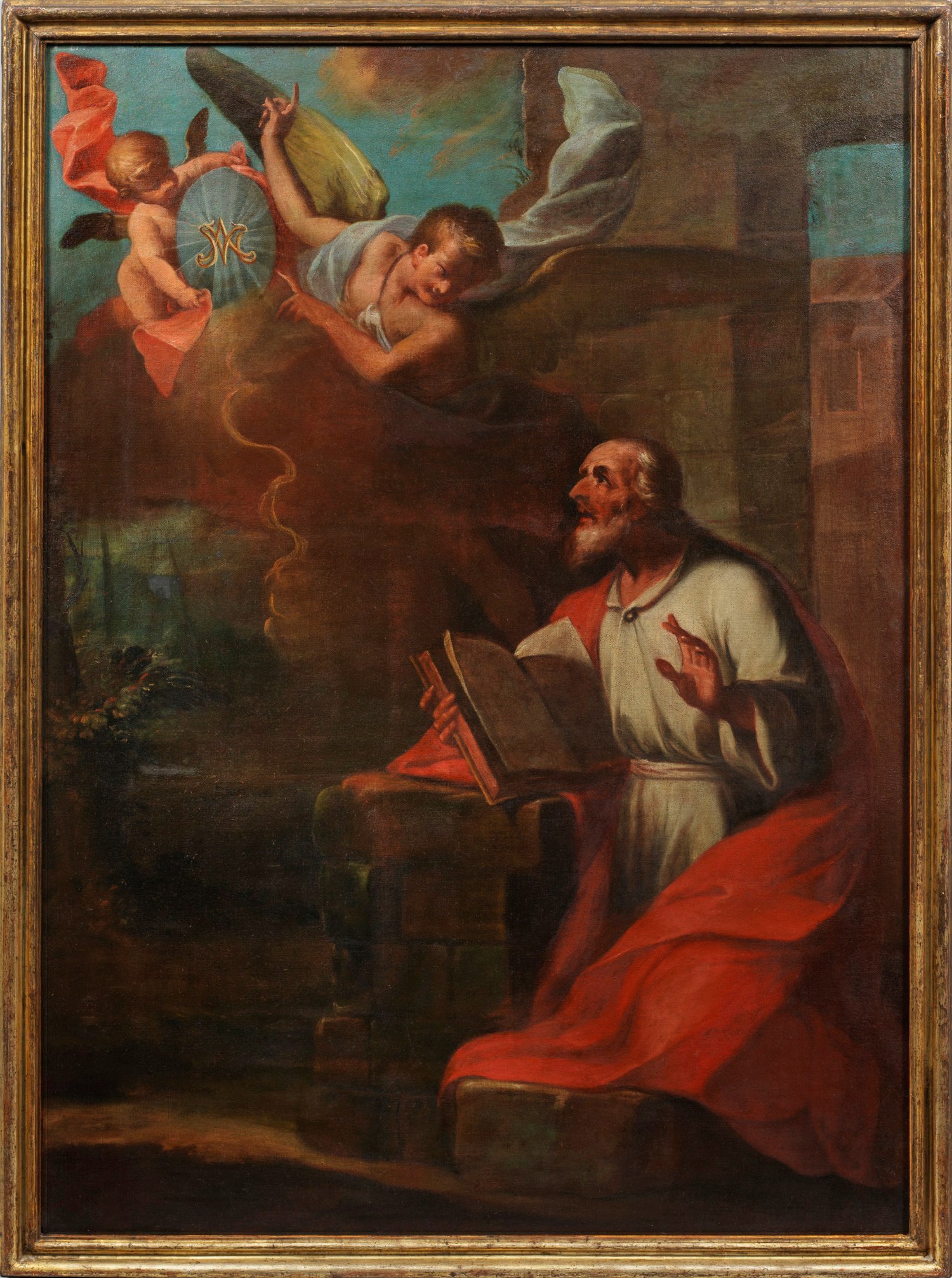 Szenische Darstellung des an einer Mauer knienden Heiligen in weißem Habit und rotem Mantelumhang, der mit seiner rechten Hand ein aufgeschlagenes Buch hält, während er zu einem größeren und einem kleineren Engel aufblickt. Diese halten eine Kartusche mit dem Marienmonogramm, der größere Engel deutet wiederum zum Himmel. Großformatiges Andachtsbild des Barock, das mit Filippo Neri (1515 - 1595) zugleich eine herausragende Gestalt der Gegenreformation im Rom des 16. Jhs. wiedergibt. Neri war Mystiker, volksnaher Geistlicher und Ordensgründer, überdies erhielt er den Ehrentitel "Zweiter Apostel von Rom". Seit seiner Heiligsprechung im Jahre 1622 wurde Neri schon im 17. Jh. zu einem weitverbreiteten Motiv vieler Maler, vornehmlich in Italien: u. a. von Giovanni Francesco Barbieri gen. Guercino, Guido Reni und Giovanni Francesco Guerrieri. Öl/Lwd.; 139 cm x 104 cm. Wohl Original-Rahmen.