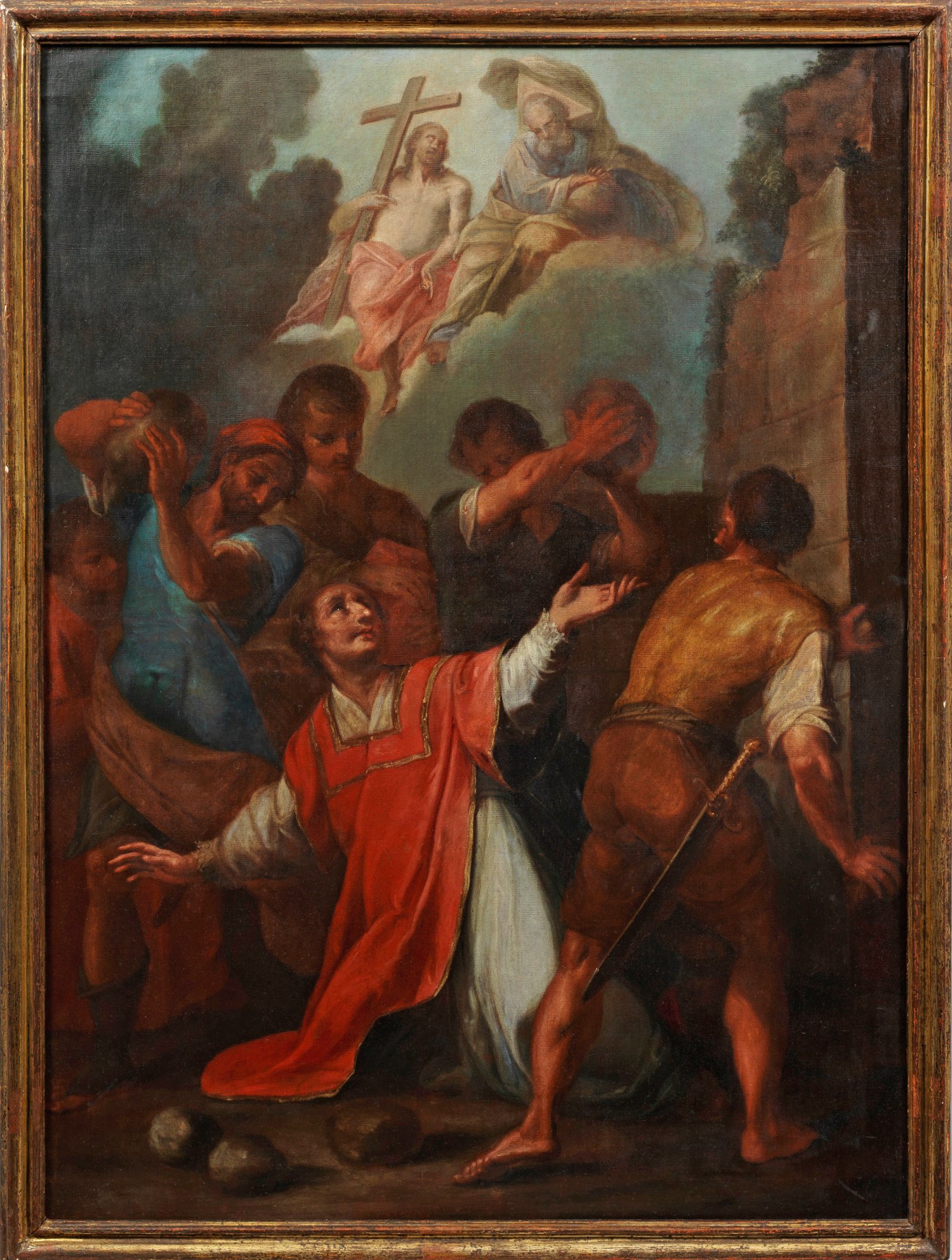 Szenische Darstellung des Martyriums des knienden Heiligen durch die Steinigung, umringt von Schergen; darüber im sich öffnenden Himmel dessen Vision in Gestalt von Christus und Gottvater. Großformatiges Andachtsbild, dessen Stil und Ikonographie auf einen italienischen Maler schließen lassen. Stephanus, Prophet und bereits in der Apostelgeschichte erwähnter, allererster christlicher Märtyrer, wurde besonders im Zuge der Gegenreformation zum Motiv vieler Märtyrerbilder, wobei das Martyrium oft mit der Vision verknüpft wurde. Öl/Lwd.; 137,5 cm x 101 cm. Wohl Original-Rahmen.