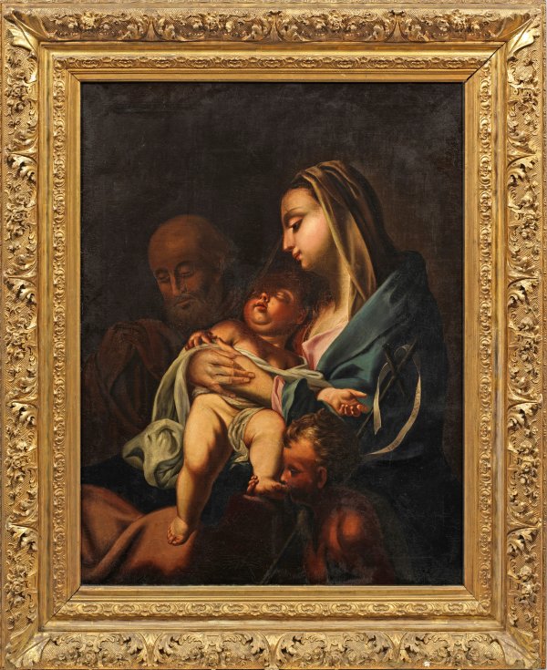 Darstellung Mariens mit dem schlafenden Kind in den Armen, dessen linker Fuß von Johannes geküsst wird. Johannes wird in Halbfigur im Profil wiedergegeben, geschultert hält er einen Kreuzstab mit dem Schriftband "AGNUS DEI" als Symbol der zukünftigen Passion. Das Gemälde gehört zu den zahlreichen Kopien des 18. Jhs., in mehreren Versionen von Trevisani selbst und seiner Werkstatt ausgeführten, nach der um 1710-1730 offenbar höchst beliebten Komposition (u.a. im Landesmuseum für Kunst und Kulturgeschichte in Oldenburg, im Art Institute of Chicago und im Nationalmuseum in Valletta/Malta). Trevisani war ein Schüler von Antonio Zanchi in Venedig, 1678 ging er nach Rom, wo ihn Carlo Maratta, Guido Reni, Paolo Veronese und Pietro da Cortona beeinflussten und er zu einem der angesehensten Künstler wurde. In Rom arbeitete Trevisani insbesondere für den bedeutenden Mäzen Kardinal Pietro Ottoboni, dem Neffen Papst Alexander III. und wohnte im Palazzo della Cancelleria, der Residenz des Kardinals. Öl/Lwd, doubl.; 105 cm x 78 cm. Rahmen.