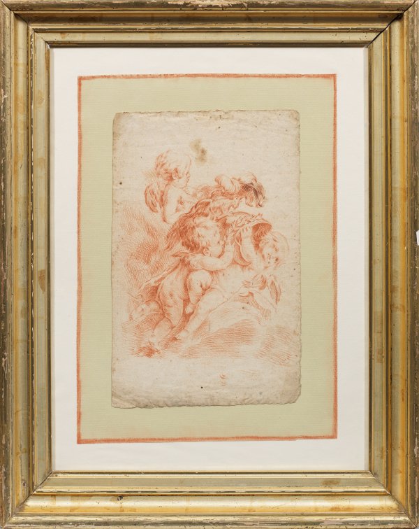 Fein ausgeführte Zeichnung des 18. Jhs. nach einer Komposition Bouchers, die bereits zu seinen Lebzeiten als Druckgrafik durch Louis Félix de La Rue (1731 - 1765) publiziert wurde (Vgl. ein Exemplar im Metropolitan Museum Of Art, New York, Inv.-Nr. 57.559.38[3]). Rötel/Bütten. Blatt ca. 35 cm x 22,5 cm. Rahmen.