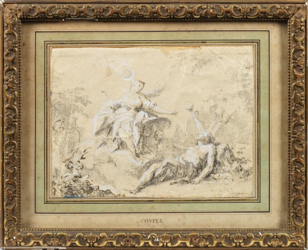 Szenische Darstellung der Jagdgöttin Diana, die sich in den Hirten Endymion verliebte und ihn durch Zeus in den ewigen Schlaf versetzen ließ, nur um jede Nacht die Schönheit des Jünglings bewundern zu können. Coypel stammt aus einer bedeutenden, äußerst erfolgreichen und einflussreichen Historienmalerfamilie. Sein Vater Antoine Coypel, erhielt zahlreiche Aufträge von der Königsfamilie, insbesondere von Philippe II., Herzog von Orléans, außerdem wurde er 1714 Direktor der Académie Royale und 1715 Premier Peintre du Roi. Coypel lebte fast sein ganzes Leben im Louvre-Palast, er hatte mindestens fünfzehn Räume unter der Grande Galerie als 3000 qm Atelierfläche. Auch Charles Antoine war hochtalentiert, sodass er 1715 am selben Tag von der Académie zum Agréé und anschließend zum Académicien ernannt wurde. 1772 trat er die Nachfolge seines Vaters als Premier peintre du Roi am Hof König Ludwig XV. an, 1747 ernannte man ihn zum Direktor der Académie. Coypel führte eine Reihe von Gemälde-Aufträgen für Schloss Versailles, Ludwig XV. und die Königin aus. Überdies schuf er zahlreiche Wandteppichentwürfe für die königliche Gobelin-Manufaktur. Mischtechnik (Tusche, Feder, Gouache u. Deckweiß)/Papier. R. u. bez.; Ber., Knickfalten. Darstellung ca. 18 cm x 24,5 cm. Rahmen.