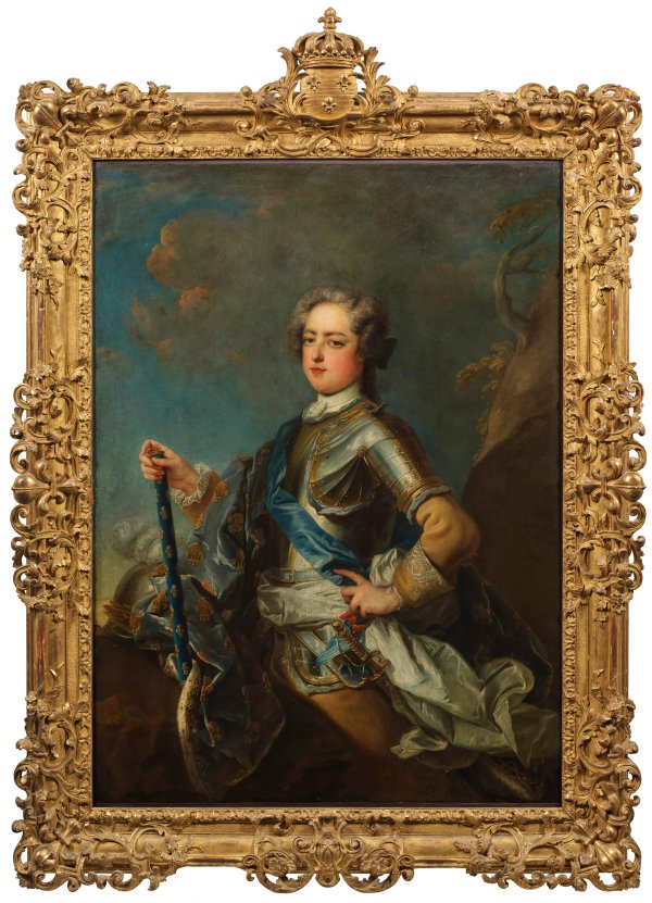 Das künstlerisch herausragende Gemälde ist eines von mehreren Porträts des jungen Königs (1710 - 1774) von Jean-Baptiste van Loo, ausgeführt wahrscheinlich kurz nach seiner Volljährigkeit im Jahr 1723, als er die vollständige Kontrolle über die Regierung übernahm. Es handelt sich um eine dreiviertellange Adaption des berühmten, ganzfigurigen, großen Staatsporträts, das 1723 entstand und sich in zwei Versionen im Schloss von Versailles und im Louvre in Paris befindet. Die ursprüngliche Komposition hat der Künstler hierbei nicht zuletzt wegen des kleineren Formats sowohl vereinfacht als auch reduziert. Es zeigt Ludwig XV. als königlichen Oberbefehlshaber über die Armeen vor einem Landschaftshintergrund ohne Krone und Zepter. Er trägt einen silber-gold glänzenden Kürass über einer ockerfarbenen Jacke, darüber einen hermelingefütterten, hellblauen Mantel, das blaue Band des angesehenen, elitären Ordens vom Heiligen Geist und um die Hüften geschlungen ein großes, weißes, seidenes Tuch. Den bestickten Mantel und den Kommandostab, auf den er seine rechte Hand stützt, sind mit den Fleur-de-lys des französischen Königswappens verziert. Gleichzeitig fertigten Jean-Baptiste van Loo und seine Werkstatt bereits 1723 in königlichem Auftrag erste Repliken, so dass das Porträt hierdurch und in weiteren Kopien schnelle, weite Verbreitung in Frankreich und Europa fand. Jean-Baptiste van Loo stammte aus einer angesehenen, ursprünglich niederländischen Künstlerfamilie von Malern, die seit der 2. Hälfte des 17. Jh. in Frankreich tätig war. Jean-Baptiste lernte zunächst bei seinem Vater Louis Abraham van Loo (1653 - 1712); in Rom wurde er von Benedetto Luti (1666 - 1724) auch zum Maler religiöser und mythologischer Themen ausgebildet. Über Turin, wo er Herzog Karl Emmanuel II. von Savoyen und seinen Hof porträtierte, ging er 1719 nach Paris zurück. Dort nahm ihn die Königliche Akademie der Künste als Mitglied auf, fortan wandte er sich zunehmend der Bildnismalerei zu und wurde ein angesehener, gefragter Porträtist der Aristokratie. Nachhaltig beeinflusste er besonders seinen jüngeren Bruder Charles André van Loo (1705 - 1765) gen. Carle van Loo. 1737-1742 war Jean-Baptiste van Loo in London tätig, wo er ebenfalls als Porträtmaler reüssierte. Es entstanden dort u. a. Bildnisse des Schatzkanzlers Sir Robert Walpole (in der National Portrait Gallery in London) und des Prinzen und der Prinzessin von Wales. Öl/Lwd. doubl.; 134 cm x 99 cm. Originaler, vergoldeter Regence-Prunkrahmen, den oberhalb das Wappen Frankreichs mit der Königskrone ziert, unterhalb eine Kartusche mit dem königlichen ligierten "LL"-Monogramm.