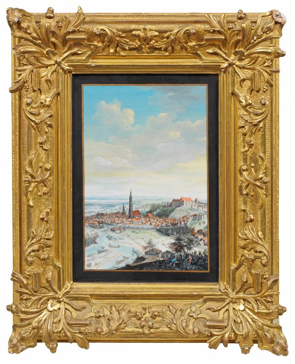 A view of Trausnitz Castle and Landshut. Gouache on paper or vellum. Original frame.