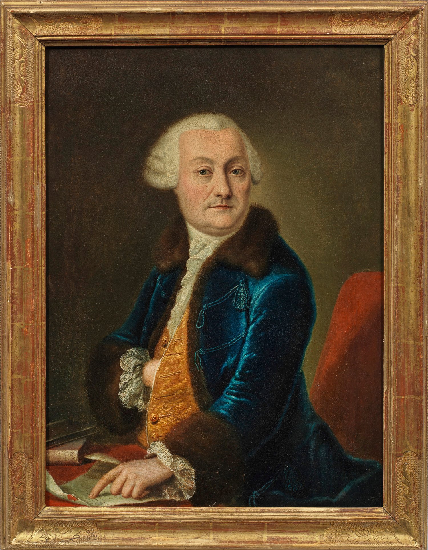 Repräsentatives, höfisches Hüftbildnis eines Edelmannes in feinem Spitzenhemd und royalblauem, pelzverbrämten Gehrock, mit der linken Hand auf ein Dokument weisend. Degle lernte in Augsburg beim Freskomaler Thomas Schäffler. Durch Studienaufenthalte in Innsbruck, Ancona, Venedig und Rom verfeinerte er sein Können und gewann schließlich 1765 in Rom den 2. Preis der Accad. di S. Luca. Danach ließ er sich in Augsburg nieder und wurde vor allem durch seine Porträts bekannt. Neben seinen Fresko- und Altararbeiten in der Gegend um Augsburg, befinden sich Beispiele seiner Werke heute u.a. im Bode Museum Berlin und im Bayerischen Nationalmuseum in München. L. u. im Dokument sign. sowie dat. pinx 1764. Verso Rahmen bez. F. J. Degle, dat. 1768. Öl/Lwd.; 31 cm x 43 cm. Wohl Original-Rahmen.