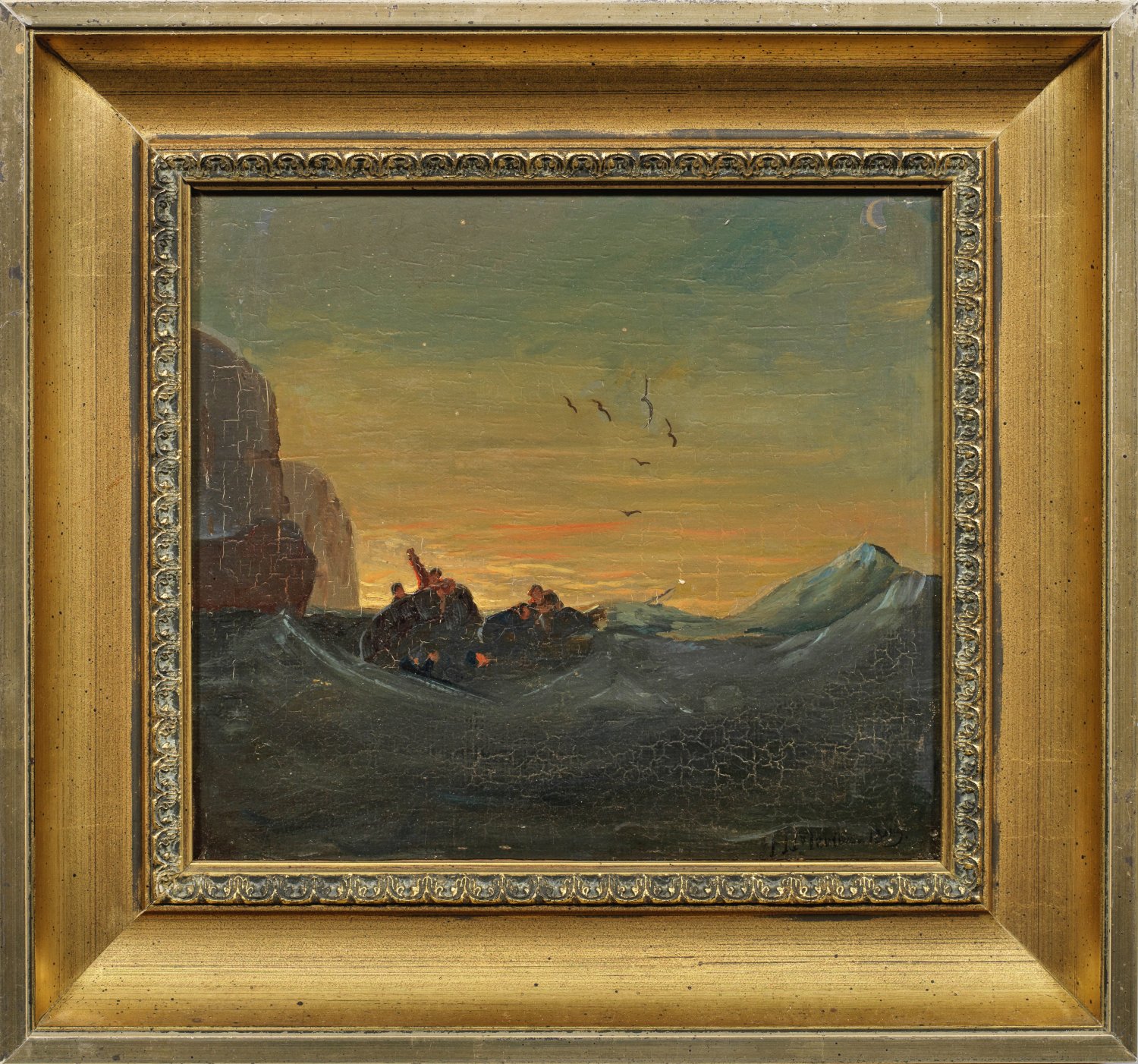 Charakteristische Impression des Marine- und Landschaftsmalers, der 1836-1840 an der Akademie in Düsseldorf studierte und vor allem durch seine Küstenlandschaften mit meisterhafter Wiedergabe der Wolken- und Lichtstimmungen sowie der Brandung herausragte. Öl/Holzplatte. R. u. sign. und dat. 1843 (oder 1849). Verso bez. u. dat. "H. Mevius / 1843". 19,8 cm x 22,3 cm. Rahmen.