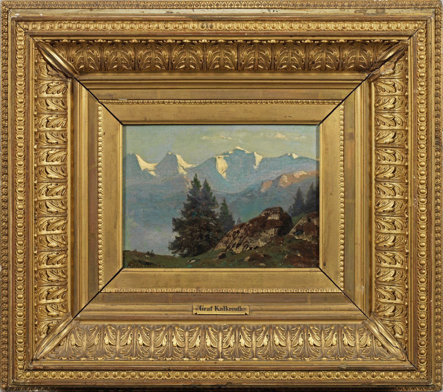 Kleine Landschaftsimpression Kalckreuths, der 1846-1849 an der Düsseldorfer Akademie u. a. bei Johann Wilhelm Schirmer studierte. 1858 zog er nach Weimar, war Mitbegründer der dortigen Großherzoglich-Sächsischen Kunstschule, 1860-1876 deren Direktor. 1883 lebte er in München. Mit Vorliebe malte Kalckreuth menschenleere Gebirgslandschaften. Öl/Lwd.; L. u. sign.; Verso bez. u. betitelt "Eiger, München und Jungfrau von (...?) gesehen". 17,5 cm x 23,5 cm. Original-Rahmen.