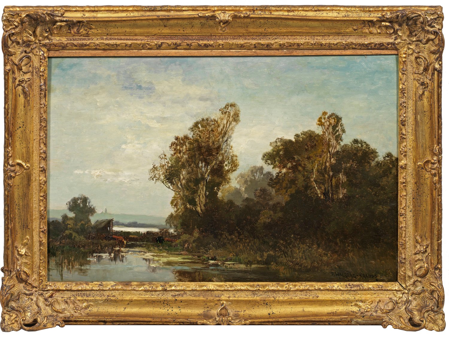 In tonigem Kolorit gemalte Landschaftsimpression mit effektvoller Lichtstimmung. Der an der Münchener Akademie ausgebildete und ab 1908 regelmäßig im Glaspalast ausstellende Maler schilderte zumeist oberbayerische Landschaften im Wandel der Jahreszeiten, oft Gewitter- und Herbststimmungen. Öl/Holztafel. R. u. sign.; 39 cm x 60 cm. Rahmen.