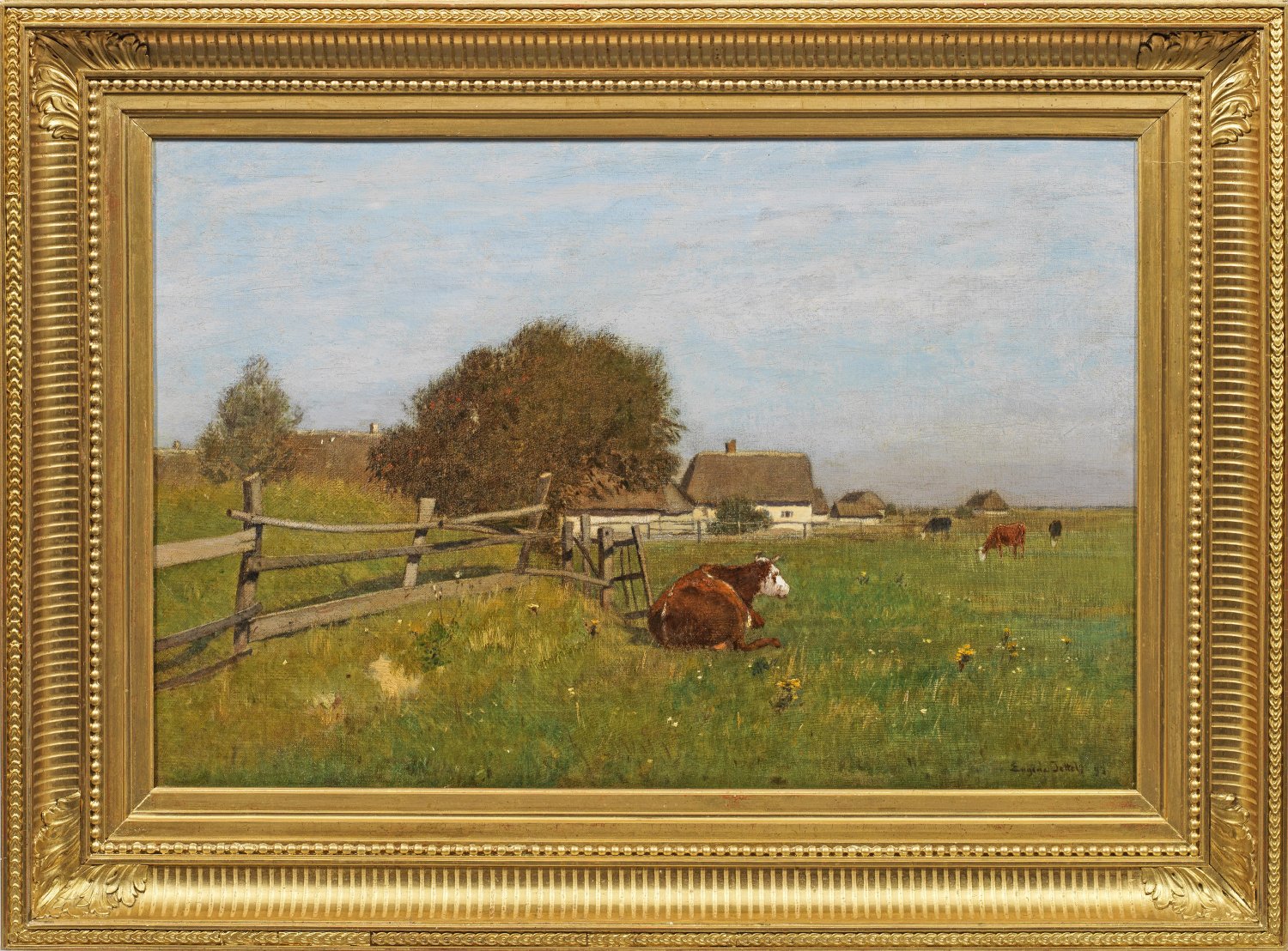 Stimmungsvolles, von der Schule von Barbizon und den Impressionisten beeinflusstes Werk des Künstlers. Jettel studierte 1860-1869 Landschaftsmalerei an der Wiener Akademie bei Albert Zimmermann. Studienreisen führten ihn nach Holland, Italien, Istrien und Ungarn, abschließend nach Frankreich, wo er von der Malerei von Jules Dupré und Théodore Rousseau geprägt wurde. 1873 oder 1875 ging Jettel nach Paris, wo er auch in der französischen Hauptstadt reüssierte und regelmäßig auf den unterschiedlichen Salons vertreten war. Jettel fand Anschluss an die Schule von Barbizon und französische Künstlerkollegen, 1897 wurde er als besondere Ehrung Ritter der Ehrenlegion. Außer Goldmedaillen in Paris (1889) erhielt er weitere bei den Kunstausstellungen bzw. Weltausstellungen in Antwerpen und Chicago (1893). 1897 kehrte Jettel nach Wien zurück, wo er Gründungsmitglied der Wiener Secession wurde und 1899 auf deren IV. Ausstellung vertreten war. Öl/Lwd.; R. u. sign. u. dat. (18)93. 43,5 cm x 65 cm. Rahmen.