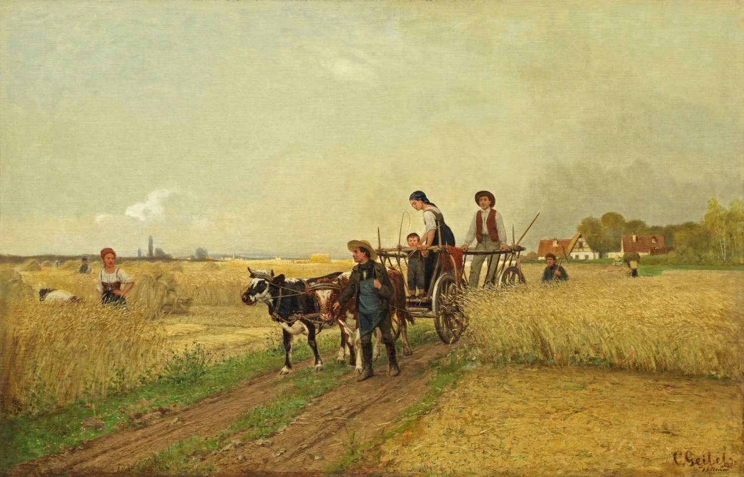 Ländliche, realistisch gemalte Szene mit Bauernfamilie und einem von Ochsen gezogenen Karren. Geibel studierte ab 1863 an der Kunstschule in Weimar bei Arthur Georg v. Ramberg, Ferdinand Pauwels und Albert Brendel. In den 1870er Jahren verband Geibel stimmungsvolle Landschaften mit Genreszenen, besonders Markt- und Erntemotiven, die ihn zu einem geschätzten Maler werden ließen. 1870-1892 war er vielfach in der Berliner Akademie-Ausstellung und im Münchener Glaspalast mit Gemälden vertreten. Öl/Lwd., doubl.; R. u. sign. mit Ortsangabe Weimar. 65 cm x 100 cm.