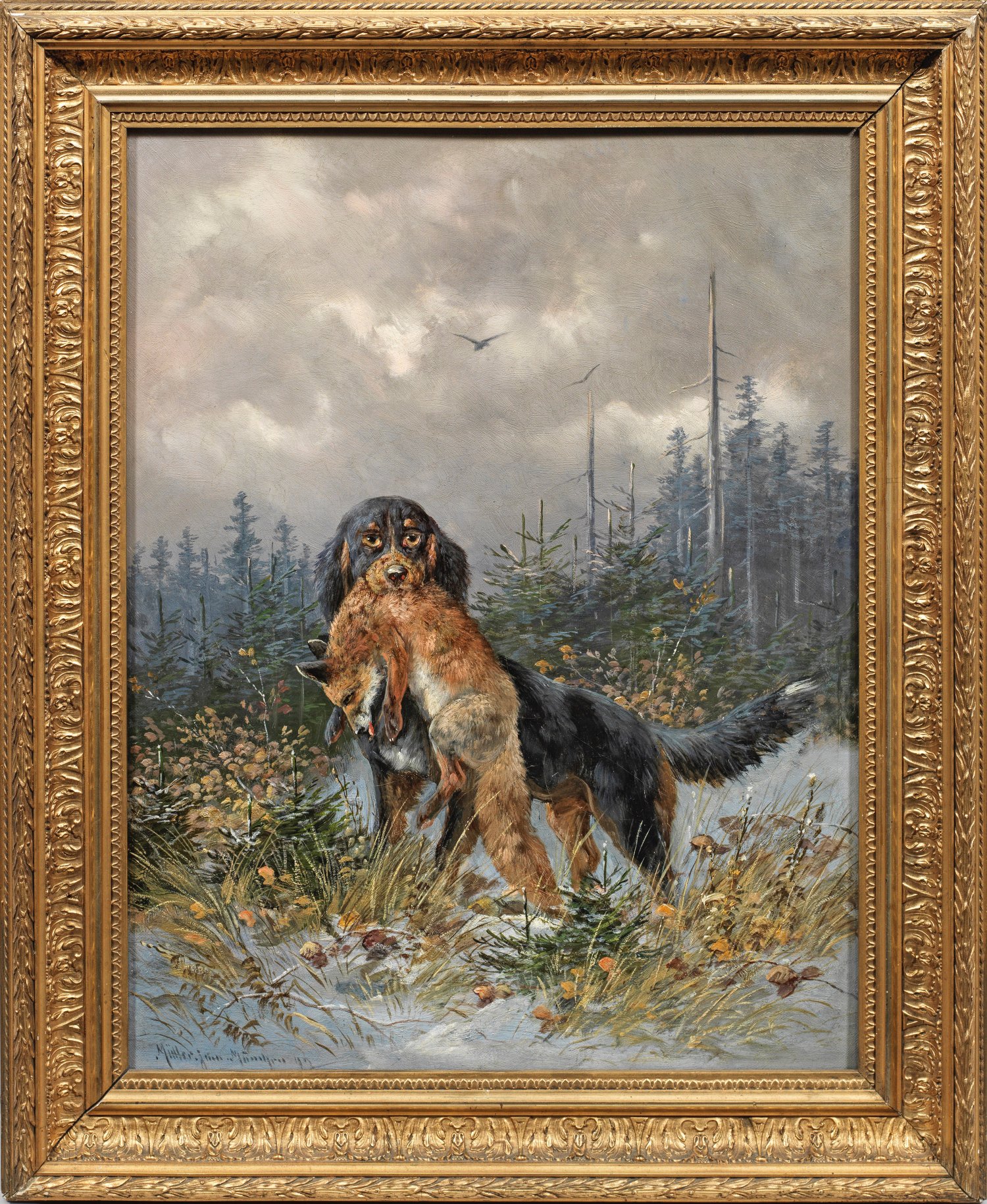 Unter dramatisch bewölktem Himmel mit kreisendem Greifvogel die verschneite Lichtung eines Nadelwaldes, auf der der Gorden Setter die erlegte Beute apportiert. In Kolorit und Lichtführung effektvoll inszeniertes und mit dynamischem Duktus gemaltes Werk des bekannten Wild- und Jagdmalers, der bei senem Vater Moritz Müller dem Älteren (1841 - 1899) lernte. Öl/Lwd.; L. u. sign., mit Zusatz "Jun." und Ortsangabe München sowie dat. (18)92. 50,5 cm x 40,5 cm. Rahmen.