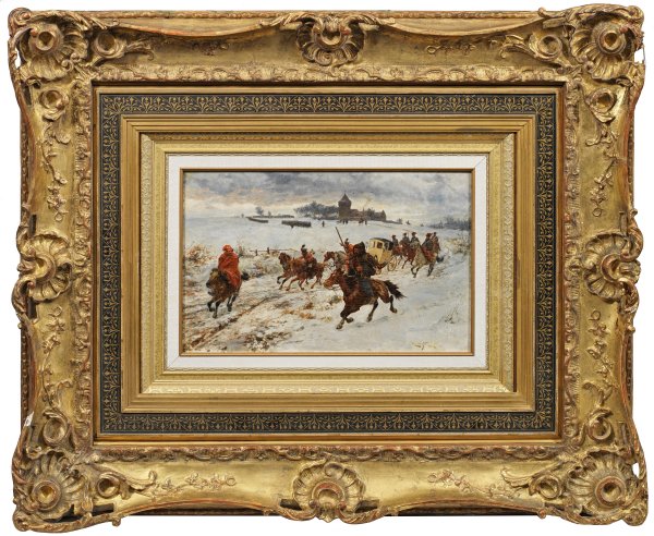 Vielfigurige, lebendig geschilderte Szene mit einem Zug von berittenen Kosaken zum Schutz einer Kutsche, im Hintergrund aufmarschierende Truppen vor einer Burg. Sehr charakteristisches und fein gemaltes Werk des bedeutenden Schlachten- und Orientmalers, mit höchst eindrucksvoller Darstellung der Reiter als Momentstudie. Ottenfeld studierte an der Wiener Akademie, 1893-1893 war er in München ansässig, 1893-1900 in Wien, bevor er 1900 Professor an der Prager Akademie wurde. 1896 erhielt er auf der Internationalen Kunstausstellung in Berlin eine kleine Goldmedaille. 1897-1903 war er Mitglied der Wiener Secession. In seinem Oeuvre befasste er sich außer mit Darstellungen der österreichischen Armee insbesondere mit Orientmotiven sowie Szenen aus dem Kaukasus und dem russischen Zarenreich. Öl/Mahagonitafel. R. u. sign. u. dat. (1)884 mit Ortsangabe München. 25,4 cm x 40 cm. Rahmen.