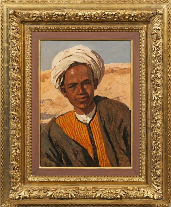 Seltenes, ausdrucksstarkes Bildnis des bedeutenden Orientmalers. Macco, der 1880-1887 an der Kunstakademie Düsseldorf bei Eugen Dücker und Johann Peter Theodor Janssen studierte, unternahm weite Studienreisen, die ihn außer nach Athen u. a. nach Konstantinopel, Ägypten, in den Vorderen Orient und nach Indien führten. Werke des Künstlers befinden sich u.a. in Museen in Prag, Aachen, Düsseldorf und München. Öl/Lwd.; R. u. sign. mit Ortsangabe Theben. Verso wohl eigenhändig bez. "Georg Macco" und betitelt "Fellache (Eselstreiber)"; altes bzw. originales Ausstellungsetikett "Ständige Gemälde-Ausstellung L. Van Hees Saarbrücken". 47 cm x 34 cm. Rahmen.
