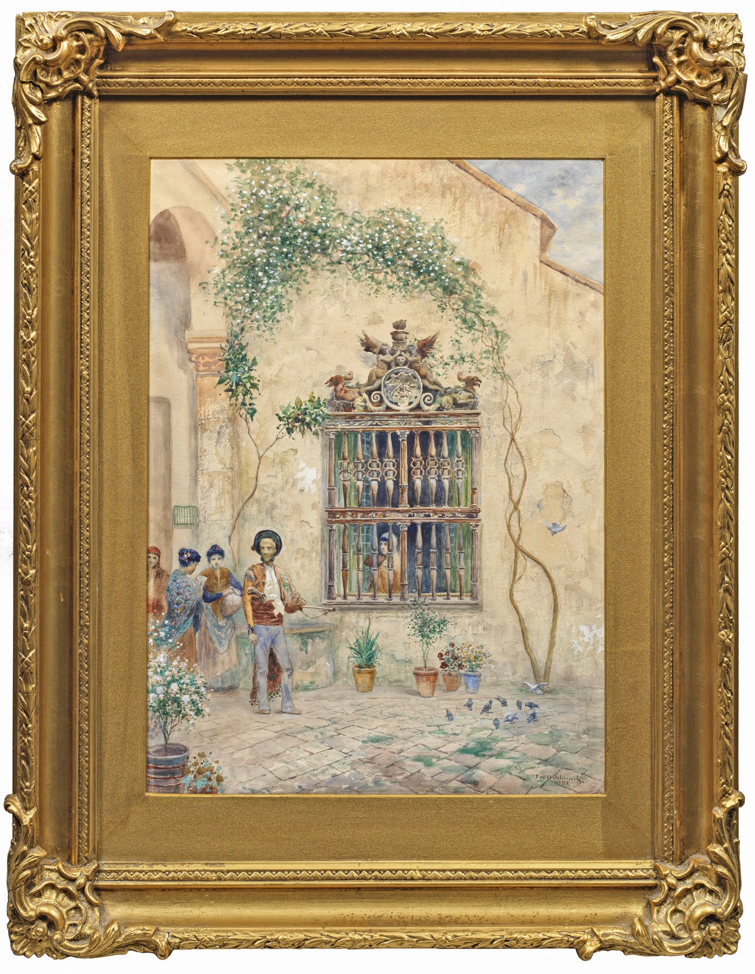 Pittoreske, subtil wiedergegebene Architekturdarstellung, belebt durch zarte Bepflanzung, eine kleine Vogelschar und in farbenfrohen traditionellen Kostümen gekleideten Personen. Charakteristische, in duftig hellem, weichem, pastelltonigem Kolorit gemalte, heitere Ansicht Odelmarks, der 1866-1868 an der Stockholmer Akademie studierte und 1870-1884 in Düsseldorf, Italien, Spanien und München tätig war. Bekannt wurde der schwedische Genre- und Architekturmaler vor allem durch seine in meisterhaft nuancierter Lichtstimmung geschaffenen Veduten aus dem Orient, Italien und Spanien. Aquarell über Bleistift/Bütten. R. u. sign. und dat. 1895. Verso schwer leserlich bez. "... in Sevilla". 79 cm x 58,8 cm. Rahmen.