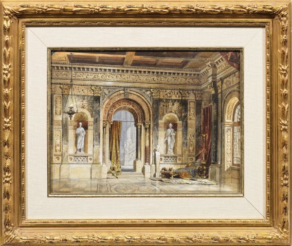 Feinmalerisch ausgeführtes, in der Lichtwiedergabe beeindruckendes Werk Jannys, das auch seiner Profession als gefragter Bühnenbildner und Theaterdekorationsmaler entspricht. Janny arbeitete u. a. im renommierten Atelier der Maler Carlo Brioschi, Hermann Burghart und Johann Kautsky; zusammen mit Karl Schüller malte Janny 1898 den Hauptvorhang für die Wiener Volksoper, um 1906 gestaltete er Bühnenbilder zur Erfolgsoper "Die Königin von Saba". In seinen daneben entstandenen Landschaftsbildern schuf Janny oft Szenerien mit symbolistischen Märchen- oder Zauberwelten im Stil von Arnold Böcklin und Gustave Doré. Aquarell u. Gouache/Papier. L. u. sign. u. dat. (18)94. Ca. 29 cm x 39 cm (Passepartoutausschnitt). Rahmen.