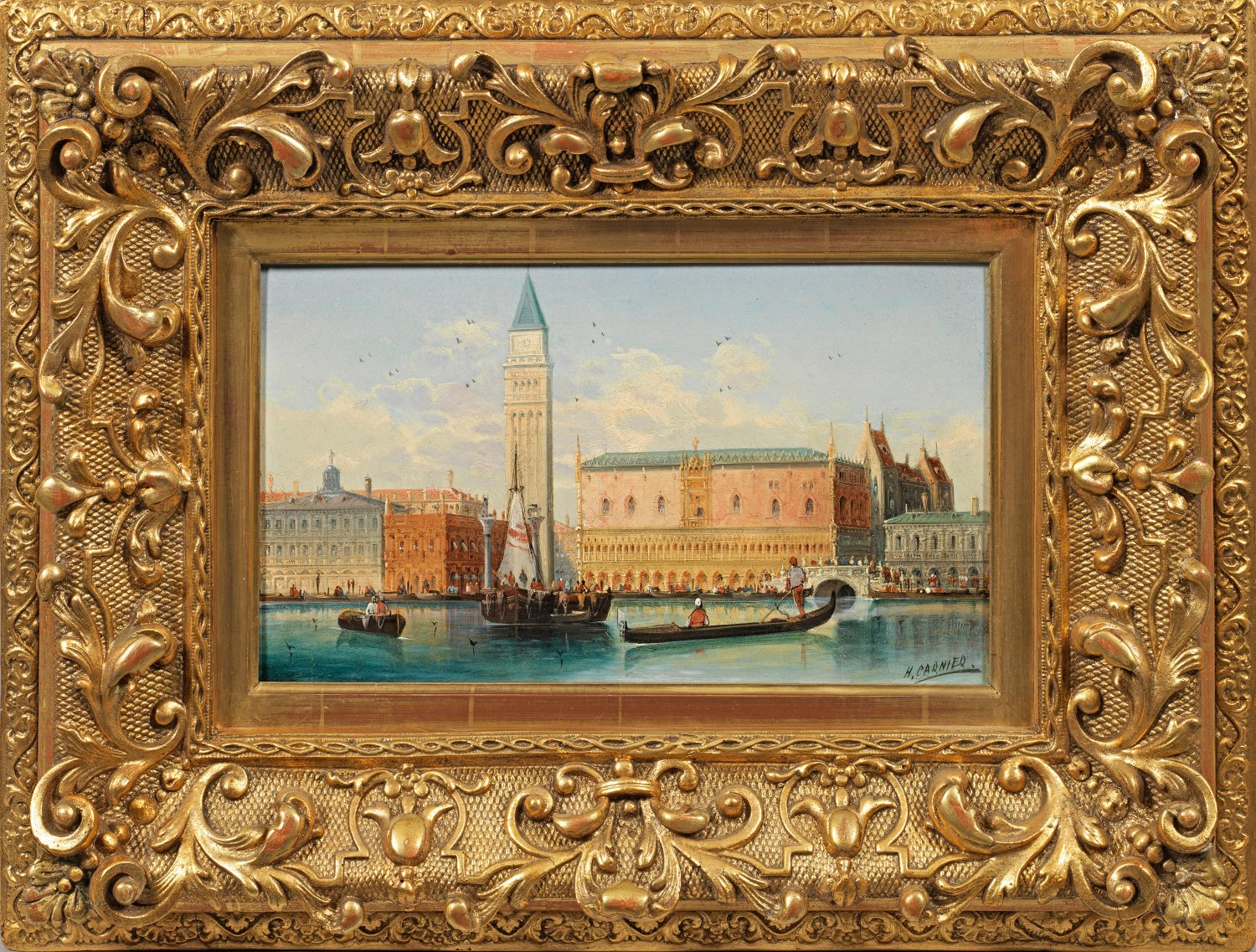 Blick vom Canale Grande (bzw. Bacino di San Marco) auf den Dogenpalast (Palazzo Ducale), Markusturm (Campanile di San Marco), im Vordergrund eine Gondel, ein kleines Segel- und Ruderboot. Stimmungsvolle, durch kleinfigurige Staffage belebte, in der für Kaufmann typischen Malweise ausgeführte Venedig-Vedute. Diese zeichnet sich durch detailgetreue, imposante Gebäude und einem virtuosen Kolorismus aus, mit der er das mediterrane Licht wiedergibt. Nach seinem Studium an der Wiener Kunstakademie wandte er sich Landschaften und vor allem Stadtansichten zu, oft wählte er hierbei Venedig als Motiv. Öl/Holztafel. R. u. sign. unter seinem Pseudonym "H. Carnier". 18,2 cm x 31,7 cm. Rahmen.