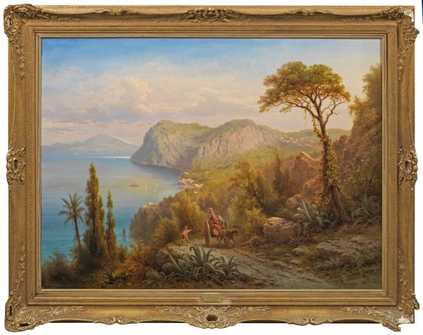 Blick von einer Anhöhe über die sonnenbeschienene Bucht, im Vordergrund an einem Weg belebt durch eine Figurenstaffage aus einem einfachen Pferdekarren mit einem jungen Bauernpaar sowie einem Knaben. Großformatige, idealisierte, motiv- und stiltypische Stimmungslandschaft Riegers. Der aus einer Künstlerfamilie stammende Maler erhielt seine künstlerische Ausbildung bei seinem Vater Giuseppe Rieger, der ein geschätzter Landschafts- und Marinemaler war. Zugleich beeinflussten ihn maßgeblich die Künstlerfreunde seines Vaters wie der Orientmaler Bernhard Fiedler. Seit den 1860er Jahren wurde er zunehmend durch Ausstellungen bekannt, so dass ab 1868 Kaiserin Elisabeth ("Sissi"), Kaiser Franz Joseph I. und der Kronprinz Rudolf Werke Riegers erwarben. Auf zahlreichen Studienreisen fand er Anregungen für reizvolle Motive in seinen Gemälden - neben den Alpen insbesondere mediterrane und orientalische Landschaften bzw. Küsten. Öl/Lwd.; R. u. sign.; Verso auf altem Etikett wohl eigenhändig bez. und betitelt " 'Capri' gemalt von Albert Rieger". 90 cm x 124 cm. Rahmen.