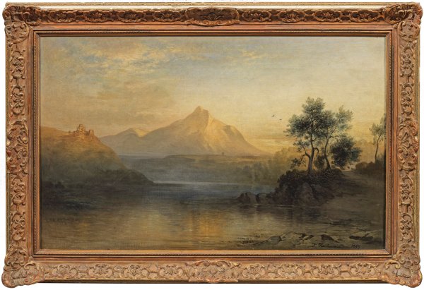 Äußerst stimmungsvolles, in der Wiedergabe der ersten warmen Sonnenstrahlen in dunstiger, morgendlicher Atmosphäre,charakteristisches Gemälde des Münchener Landschaftsmalers, der sich nach dem Besuch der Münchener Akademie autodidaktisch fortbildete. Seine Motive fand er auf seinen Studienreisen nach Italien und Südtirol, Oberbayern und Norddeutschland, aber auch Belgien und Frankreich. Öl/Lwd.; R. u. sign. u. dat. 1893. Verso betitelt bzw. mit Ortsangabe. Ger. rest.; 50 cm x 80 cm. Rahmen.