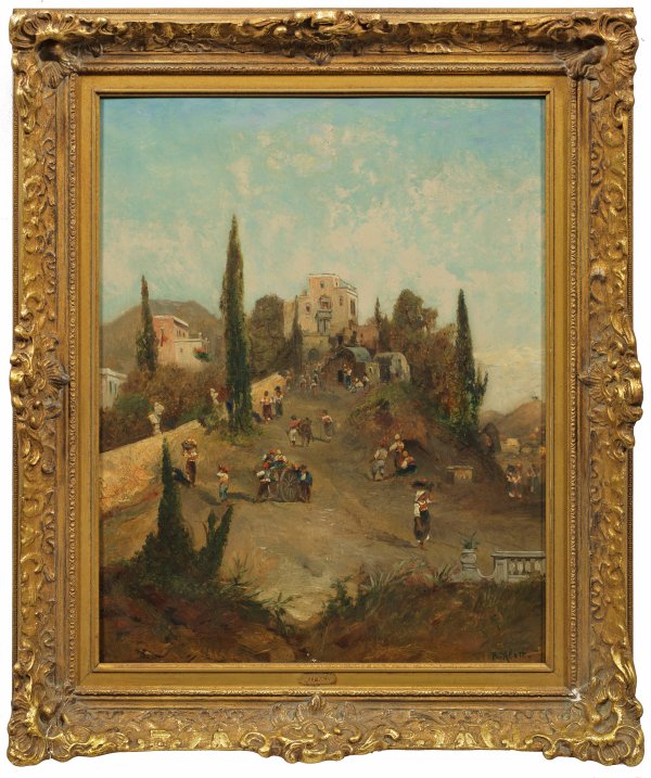 Stil- und motivtypische, mediterrane Stimmungslandschaft des bekannten, österreichischen Malers, der zahlreiche Länder der Mittelmeerküste bereiste. Alott schuf viele, durch ihr Lokalkolorit und ihre besondere Atmosphäre überzeugende Italien-Veduten, die auch den Schwerpunkt seines Oeuvres bilden. Öl/Mahagonitafel. R. u. sign.; 52,5 cm x 41,8 cm. Rahmen.