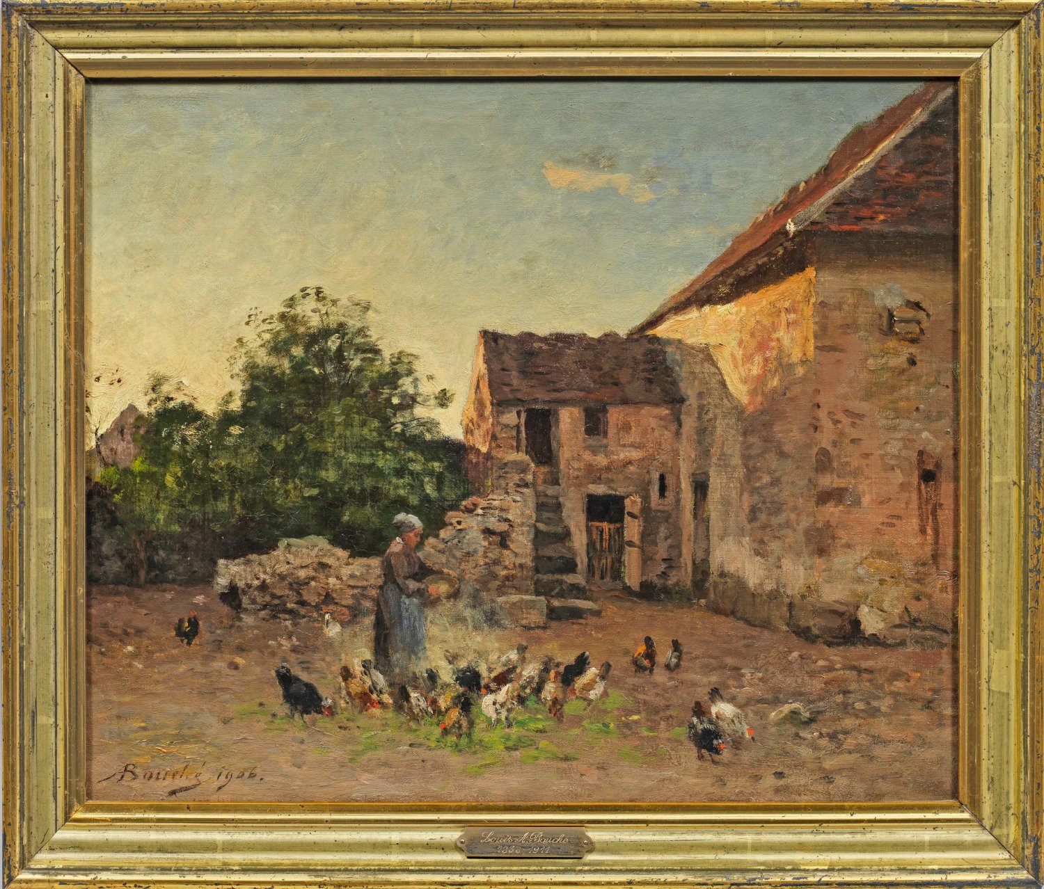 Darstellung einer Magd, im schattigen Innenhof die Hühner fütternd, während die Strahlen der tief stehenden Sonne den Himmel warm erhellen. Stimmungsvolle Impression Bouchés, der von Jean-Baptiste Camille Corot ausgebildet wurde und neben einigen wenigen Porträts überwiegend Landschaften schuf. Öl/Lwd.; L. u. sign. u. dat. 1906. 38,5 cm x 46 cm. Rahmen.