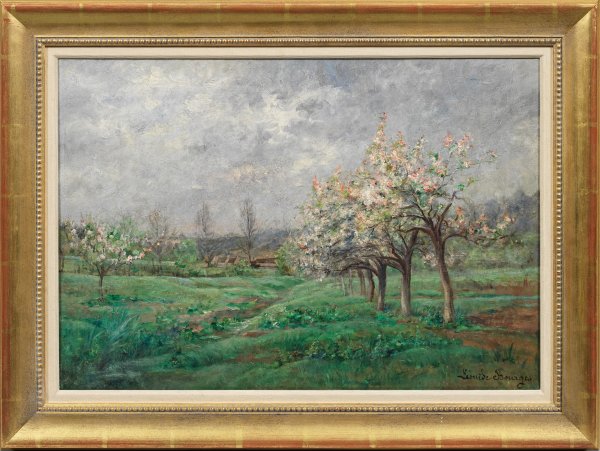 Stimmungsvolle, impressionistische Landschaft mit blühenden Obstbäumen, kleinem Bachlauf und angedeuteter Dorfkulisse, gemalt in weich-pastosem Duktus. Der dunkel verhangene Himmel wird durch effektvolle Lichtführung dramatisch in Szene gesetzt. Bourges war Schülerin von Théodore Frédéric Salmon, Pierre-Édouard Frère und Charles-François Daubigny. Unter dem Einfluss Corots praktizierte sie die Freiluftmalerei und stellte im Salon Landschaften aus, in dem sie 1857 zunächst mit einem Stillleben debütierte. 1871 zog es die Künstlerin nach Auvers-sur-Oise, wo sie zusammen mit Daubigny - nunmehr ihr Lebensgefährte - engen Kontakt zu dem Künstlerkreis um Camille Corot, Honoré Daumier, Eugène-Stanislas Oudinot de La Faverie, Adolphe-Victor Geoffroy-Dechaume und Jules Dupré pflegte. Öl/Lwd.; R. u. sign.; 38,5 cm x 55,5 cm. Rahmen.