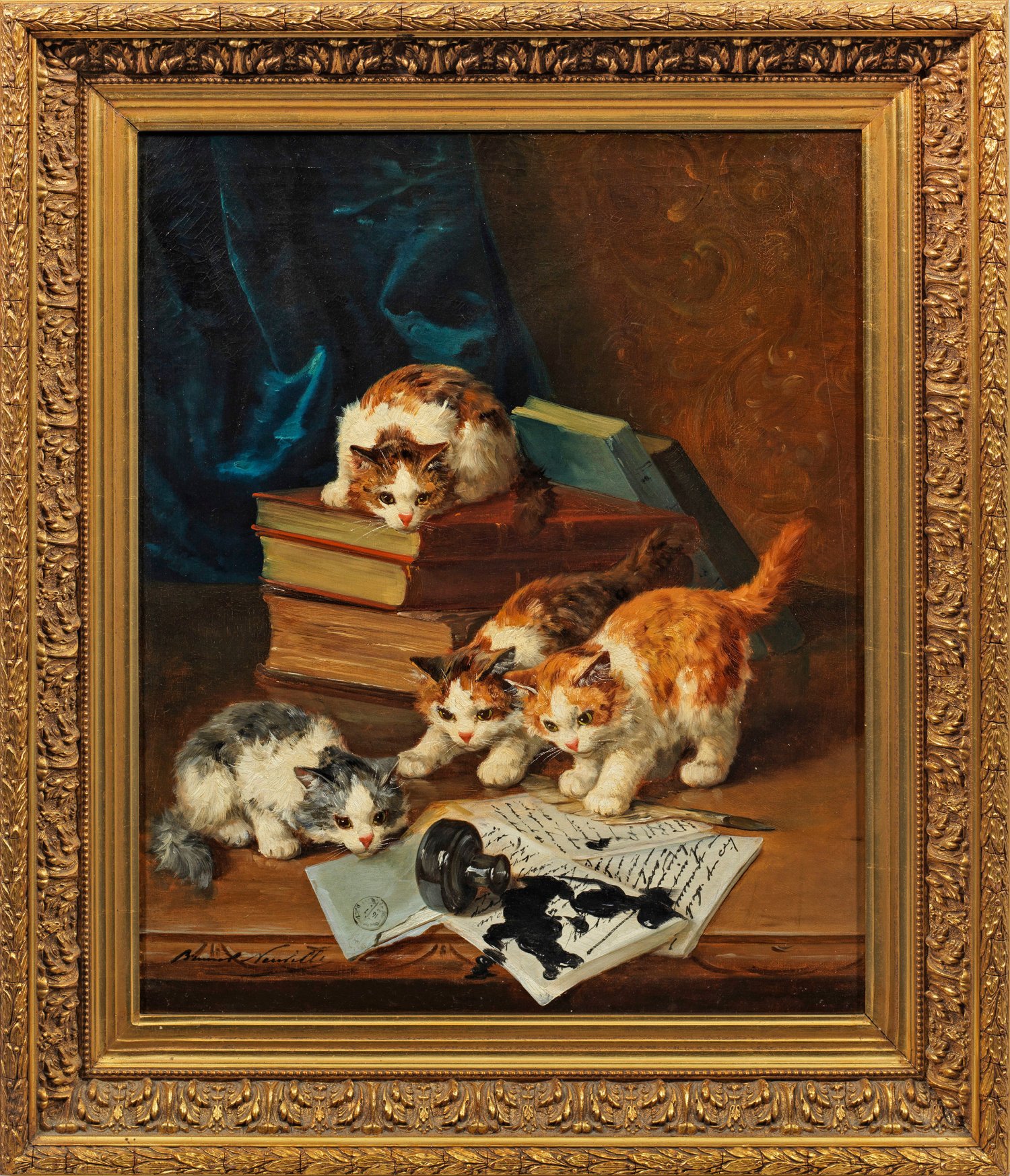 Mit virtuosem, nuanciertem, teils lockerem Duktus gemaltes, in Motiv und Stil repräsentatives Werk des bekannten Tiermalers, der mit Vorliebe possierliche, junge, spielende Katzen schilderte. Seine Gemälde ragen durch ihre außerordentlich liebevolle, genau studierte Wiedergabe der Tiere heraus. Öl/Lwd.; L. u. sign.; 66 cm x 54 cm. Rahmen.