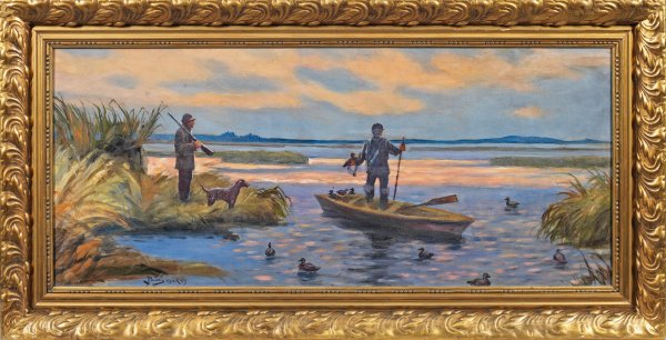 Blick auf eine morgendlich gestimmte Landschaft mit zwei Jägern, ihrem Hund und Lockenten. 1919 entstandenes, stiltypisches Werk des Künstlers, in dem für ihn charakteristischen, breiten, panoramaartigen Querformat. Der bedeutende polnische Maler studierte an der Krakauer und Münchener Akademie. Bei Fürst Anton von Radziwill in Nieswiez lernte er 1886 den deutschen Kronprinzen und späteren Kaiser Wilhelm II. kennen, für den er in den kommenden 10 Jahren häufig im Jagdhaus Hubertusstock am Werbellinsee künstlerisch tätig ist und der ihn 1889 zum Hofmaler ernennt. 1892 erhielt Falat Goldmedaillen in Berlin, München (Glaspalast) und Dresden, 1893 nimmt ihn die Preußische Akademie der Künste als Mitglied auf. 1895 kehrte Falat nach Krakau zurück, wo er zum Direktor der Kunstschule berufen wurde und diese danach zu einer vollwertigen Akademie reformierte. 1910 trat er von diesem Posten zurück und geht nach seiner Emeritierung nach Bystra in Schlesien. Sein Oeuvre umfasst neben Winterlandschaften, die Stiltendenzen der französischen Impressionisten und Münchener Secession, auch teils repräsentative Gemälde mit Motiven vom Aufbruch zur Jagd und der Heimkehr, von der Jagd auf Bären, Elche, Wildschweine, Hirsche, Enten oder Auerhähne. Öl/Malkarton. L. u. sign. u. dat. 1919. 52 cm x 120 cm. Rahmen.