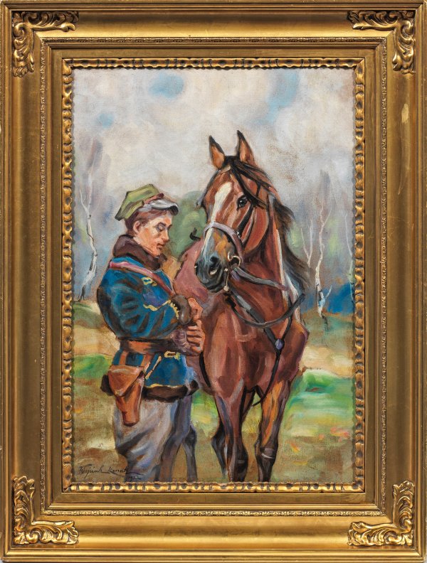 Mit schnellem, virtuos lockerem Duktus gemalte Szene in impressionistischer Landschaft. Motiv- und stiltypisches Gemälde aus dem reifen Oeuvre Kossaks, einem der bedeutendsten polnischen Maler des späten 19. und beginnenden 20. Jhs.; Kossak, Sohn des polnischen Malers Juliusz Kossak, studierte 1871-1883 in Krakau, München und Paris. Ab 1883 erzielte er erste künstlerische Erfolge - mehrere Gemälde wurden von Museen und Kaiser Franz Joseph erworben. Ruhm brachte ihm das Panorama von Raclawice ein, das er 1894/95 mit Jan Styka schuf. 1895-1902 lebte er in Berlin, wo er als erfolgreicher Schlachten- und Porträtmaler u. a. für Kaiser Wilhelm II. arbeitete. 1913 wurde Kossak Professor an der Akademie in Warschau, 1914-1918 nahm er als Maler am Ersten Weltkrieg teil. Nach dem Krieg kam er in Kontakt mit einflussreichen, politschen und militärischen Persönlichkeiten wie Marschall Ferdinand Foch und Józef Pilsudski, die er auch porträtierte. 1923-1924 und 1928-1932 lebte er in den USA. Den Schwerpunkt seiner Arbeiten bildeten vor allem nach dem Ersten Weltkrieg die verschiedenen Themen der polnischen Geschichte und Zeitgeschichte sowie Schlachten aus den Napoleonischen Kriegen. L. u. sign. u. dat. 1922. 68 cm x 48 cm. Rahmen.