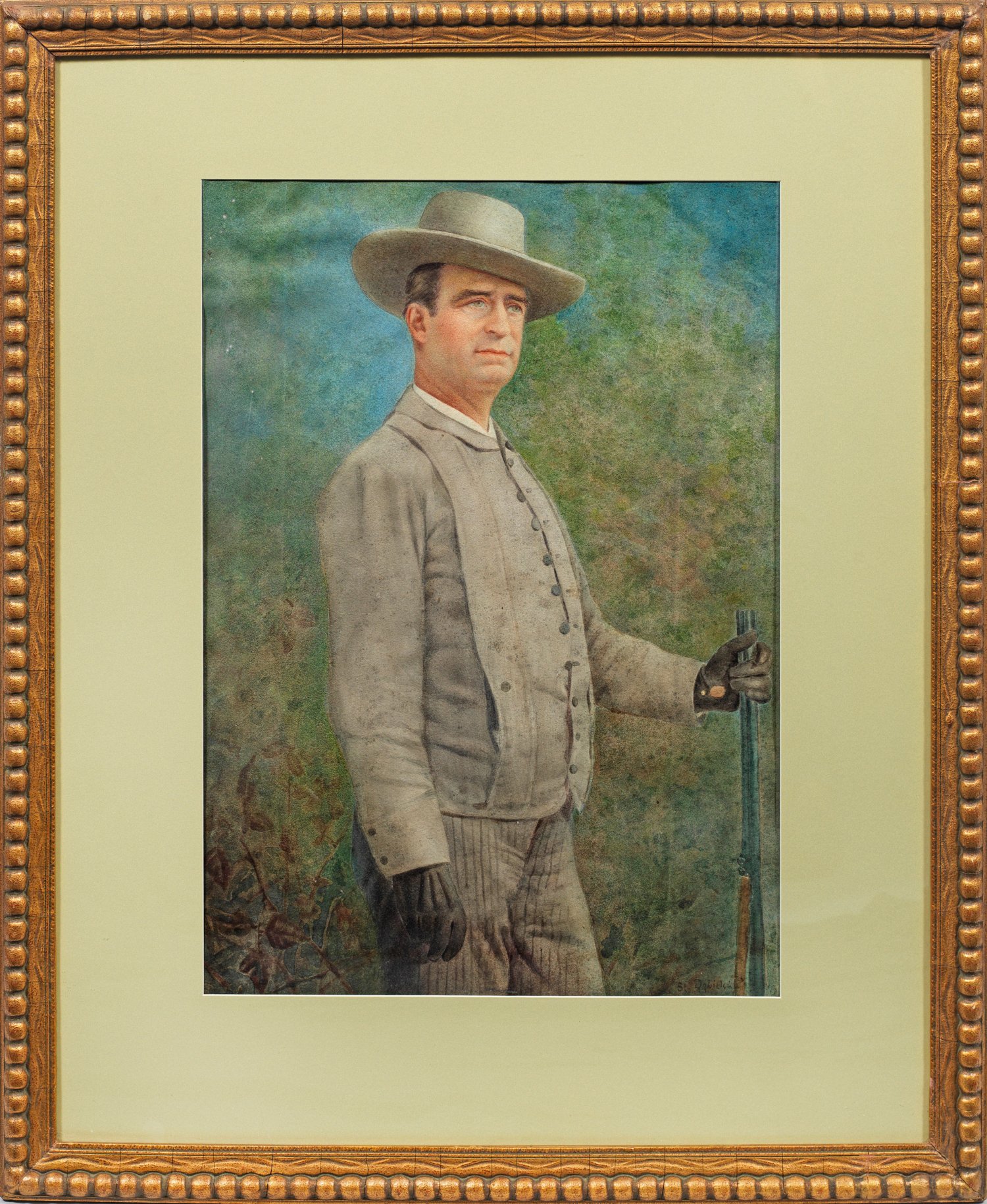 Realistisches feinmalerisch ausgeführtes Hüftbildnis im Halbprofil, dargestellt ist ein selbstbewusst posierender Mann in den mittleren Jahren, bekleidet mit hellgrauem Jagdanzug und Hut sowie schwarzen Handschuhen, der mit der linken Hand den Lauf seines Gewehrs festhält. Der polnische Maler und Illustrator studierte an den Akademien in Wien, Krakau und München bei Christian Griepenkerl, Wladyslaw Luszczkiewicz, Sándor Wagner und privat bei Paul Nauen; 1890/91 besuchte er überdies die Académie Colarossi in Paris. 1897 gehörte Debicki den ersten Mitgliedern der von Gustav Klimt und anderen Künstlern neugegründeten Wiener Secession. Seit 1909 unterrichtete er an der Akademie in Krakau, 1911-1923 als Professor. Aquarell/Papier. R. u. sign.; Ca. 60,5 cm x 43 cm (Passepartoutausschnitt). Rahmen.