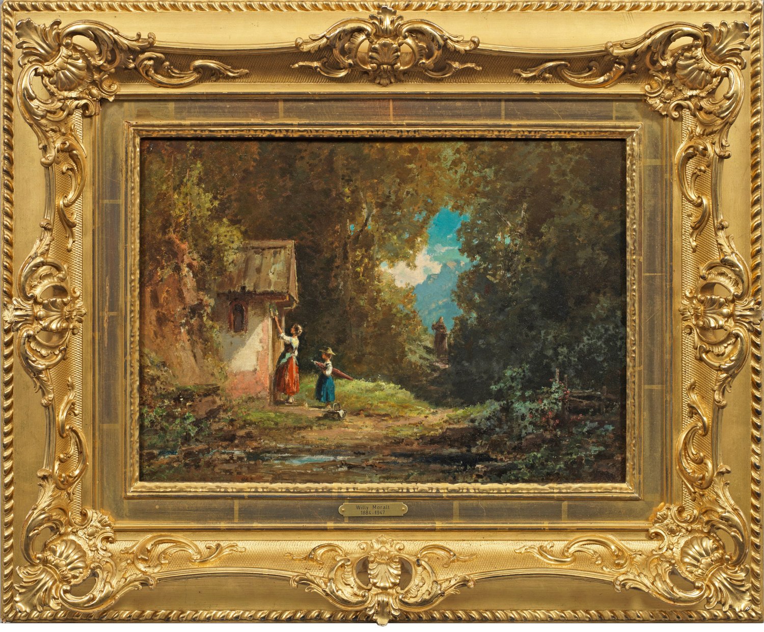 Detailreich, naturalistisch geschilderte Darstellung einer Waldlichtung mit Ausblick auf ein hohes Kalkmassiv. Vor einer Kapelle am Wegesrand steht eine junge Frau mit Kind und schmückt die Kapellentür mit einem "Kranzl", ein Blumenkranz, der für das katholische Kirchenfest Fronleichnam gebunden wird und diesem somit im Volksmund den Namen "Kranzltag" oder auch "Prangertag" verleiht. Auf dem Weg hin zur Kapelle ein Franziskaner Mönch mit Wanderstock. Biedermeierliches, sommerlich heiteres Gemälde Moralts, ganz in der Tradition Carl Spitzwegs. Er lernte bei seinem Vater Paul Moralt, einem Schüler Spitzwegs und Christian Morgensterns; überdies erbte er einige Skizzenbücher und Vorzeichnungen Spitzwegs. Ab 1903 studierte Moralt an der Münchener Akademie bei Karl Raupp und stellte schon nach kurzer Zeit erfolgreich im Münchener Glaspalast aus. Besonders beliebt wurde Moralt durch seine heiteren biedermeierlichen Spitzweg-Motive wie Einsiedler, Idyllen mit Mönchen und Mädchen, Kutschen mit rastenden Reisegruppen in poetisch idealisierten Sommerlandschaften. Öl/Holzplatte. R u. sign. und mit Ortsangabe München. 38 cm x 27,5 cm. Rahmen.