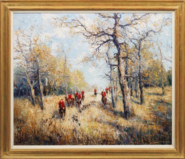 Blick auf eine sonnenbeschienene Lichtung mit reitender Jagdgesellschaft. Für den spätimpressionistischen Künstler motiv- und stiltypisches Werk. Pippel studierte in Karlsruhe und Dresden bei Gotthardt Kuehl, der ihm den Impressionismus vermittelte. Der seit 1909 vornehmlich in Planegg bei München ansässige Künstler debütierte 1911 im Münchener Glaspalast, wo er seitdem regelmäßig und vielfach ausstellte. Im selben Jahr wurde er Mitglied der Künstlervereinigung Luitpold-Gruppe. Zu den Hauptmotiven Pippels zählten außer solchen Parforcejagden insbesondere Ansichten von Seen in Oberbayern bzw. den Alpen, Münchener Bier- und Kaffeegärten sowie Ernteszenen. Charakteristisch für seinen Stil sind flimmernd wirkende Lichteffekte und ein dicht gesetzter, pastoser Farbauftrag in Spachteltechnik bzw. lockerem Pinselduktus. Öl/Lwd.; R. u. sign.; Verso auf Original-Atelier-Etikett (mit Ortsangabe Planegg) vom Künstler betitelt. 95,5 x 116 cm. Rahmen.