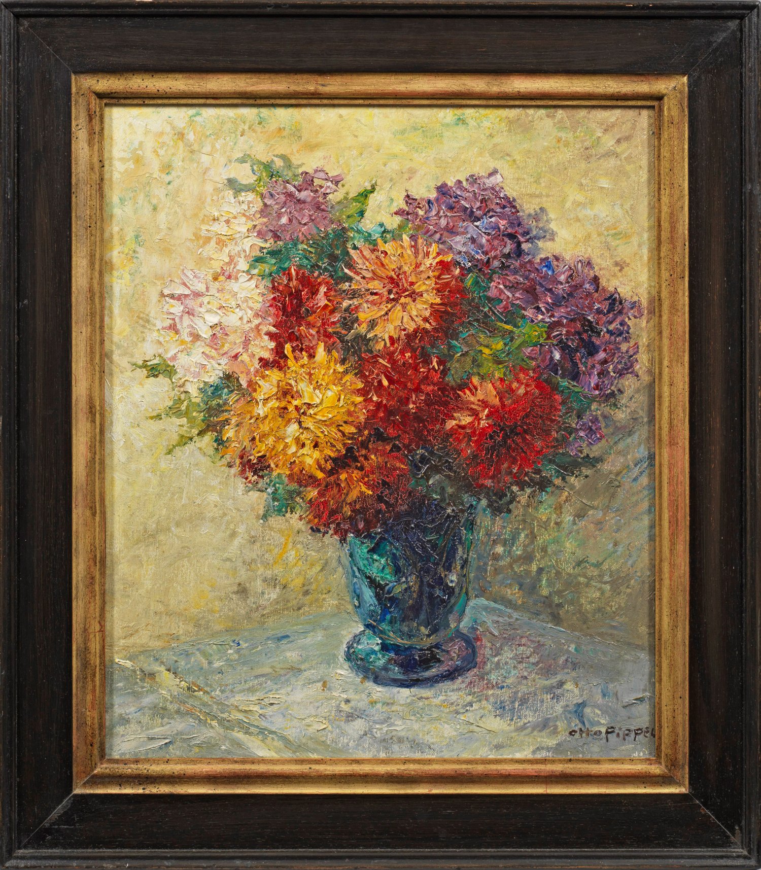 Impressionistisches Stillleben Pippels, der durch den pastosen Farbauftrag flirrende Licht- und Farbeffekte erzeugte. Pippel studierte in Karlsruhe und Dresden u.a. bei Gotthardt Kuehl, 1908 lernte er auf einer Paris-Reise die Kunst der französischen Impressionisten kennen. 1909 wurde Pippel in Planegg bei München ansässig bzw. später auch in Garmisch-Partenkirchen tätig. Seit 1912 Mitglied der "Luitpoldgruppe" stellte Pippel vielfach im Münchener Glaspalast aus. Öl/Lwd.; R. u. sign.; Verso Widmung des Künstlers "Fräulein Elfriede Methner in Verehrung Otto Pippel Planegg". 47 cm x 42 cm. Rahmen.