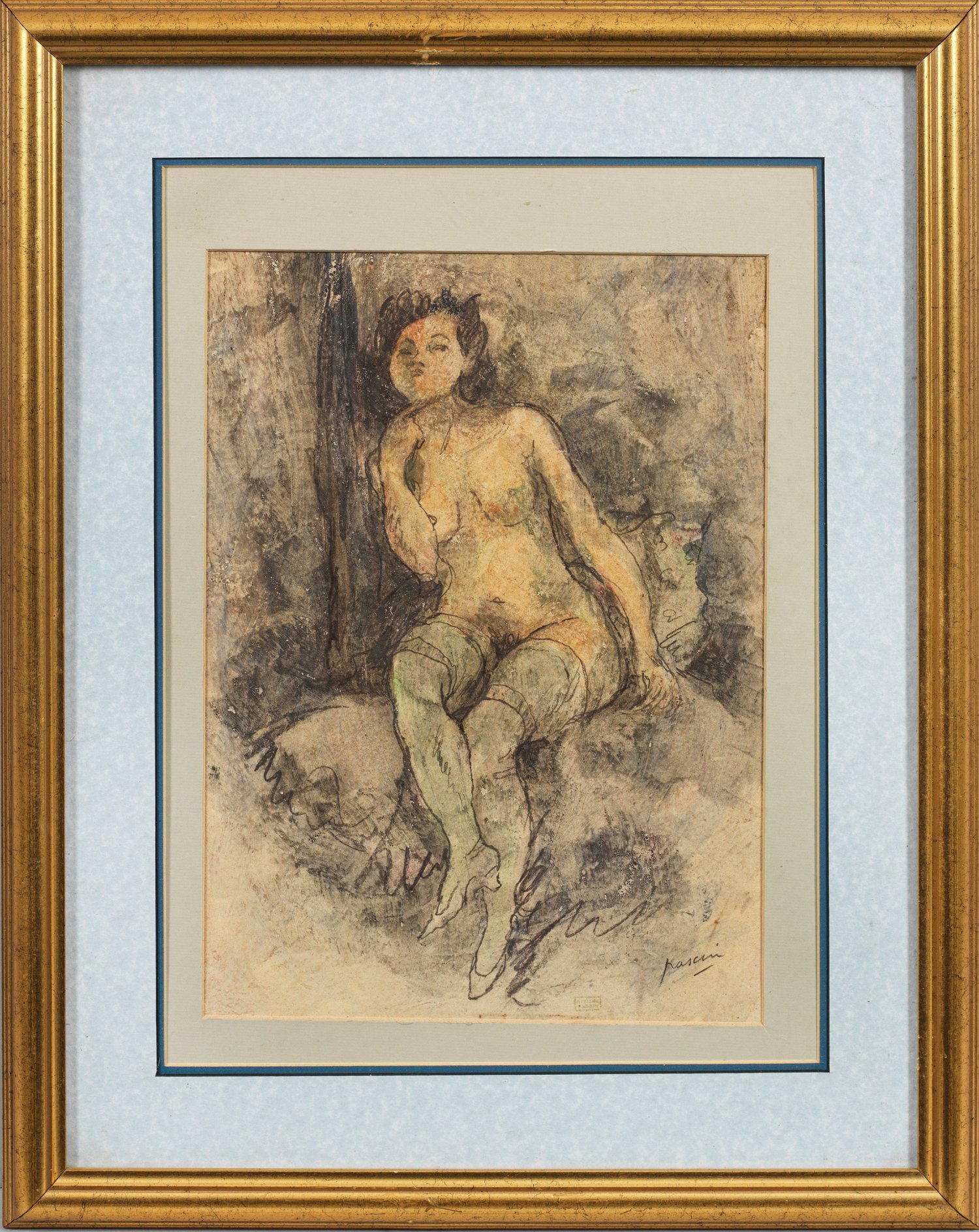 In lasziver Haltung und angedeutet überschlagenen Beinen sitzt der weibliche Akt in Strapsen und Stöckelschuhen auf Kissen und Decken und blickt den Betrachter herausfordernd an. Stil- und sujettypisches Werk Pascins, dessen Werk von erotischen Frauenakten- angelegt in unmittelbarer, lockerer Skizze vor Ort- dominiert wird. Mischtechnik/Karton. Ger. Läsuren. R. u. sign. sowie Atelierstempel. Passepartoutausschnitt 36,5 cm x 27,2 cm. Rahmen.
