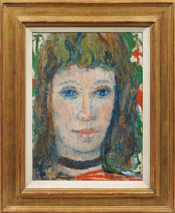 Expressionistischer Porträtkopf einer jungen Frau mit schulterlangem, braunem Haar, den Krauskopf in einem intensiv leuchtenden Kolorit mit kraftvollem, breitem Duktus malte. Es spiegelt Krauskopfs Auseinandersetzung mit Werken der Künstlergruppe "Brücke" wider. Innerhalb des Expressionismus nimmt Krauskopf eine authentische, eigene Position ein. 1916 wurde er Mitglied in der "Freien Berliner Sezession", später Vorstands- und Jurymitglied der "Berliner Sezession"; zugleich war er ab 1918 Mitglied der "Novembergruppe". 1919-1933 hatte er viele Einzelausstellungen in Museen und modernen Galerien wie u. a. Flechtheim. 1933 emigrierte Krauskopf, dessen Kunst bei den Nationalsozialisten als "entartet" galt, nach Norwegen; 1948 musste er nach New York auswandern, wo er sich mit Unterstützung von George Grosz erfolgreich in der Kunstszene der USA etablierte. Öl/Holz. R. u. sign.; Verso bez. "Prof. Bruno Krauskopf". 45 cm x 34 cm. Rahmen.