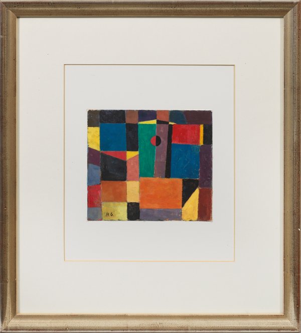 Aus variierenden Farbflächen, teils in leuchtenden Farben komponiertes Werk, geprägt durch den Einfluss der beiden Bauhaus-Meister Johannes Itten und besonders Paul Klee, dessen Schülerin sie 1928-1931 in Dessau war und Adolf Hölzels, bei dem sie 1927 in Stuttgart Schülerin war. Gouache und Tempera/Karton, kaschiert auf Karton. L. u. monogr.; Verso Nachlassstempel mit Nr. G12. 17,1 cm x 19,3 cm. Rahmen.