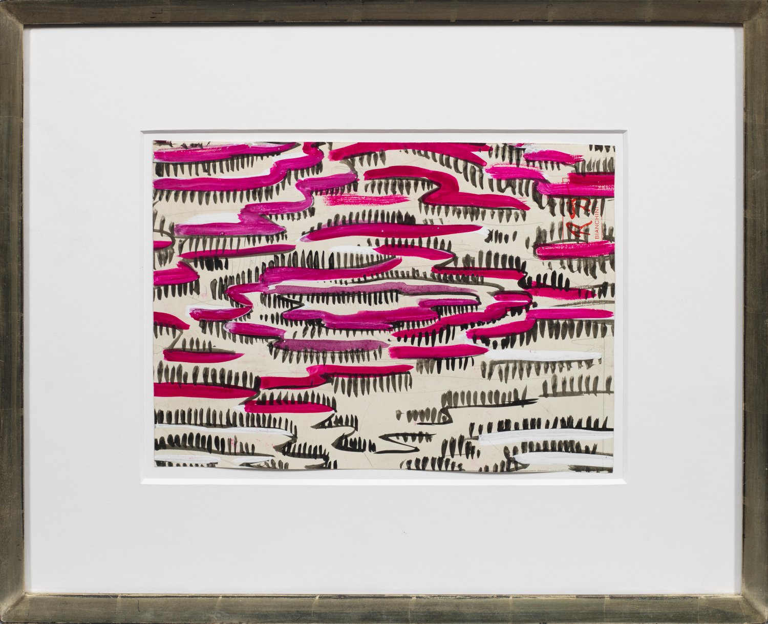 Dessin für die Fa. Bianchini-Férier in Lyon, 1911-28. Der als Maler weltberühmte Künstler Raoul Dufy war zugleich einer der einflussreichsten Textildesigner im ersten Drittel des 20. Jhs.; Er gründete 1910 mit dem Couturier Paul Poiret eine Textilwerkstätte und schuf zwischen 1912 und 1928 zahlreiche Art Déco-Entwürfe für den Textilfabrikanten Bianchini-Férier, einem renommierten Lyoner Hersteller von Seidenstoffen für Haute Couture. Gouache in Schwarz und Magenta mit Deckweiß über Bleistift/chamoisfarbenes Papier. R. roter Stempel "RD Bianchini Ferier". 25 cm x 35,5 cm. Rahmen.