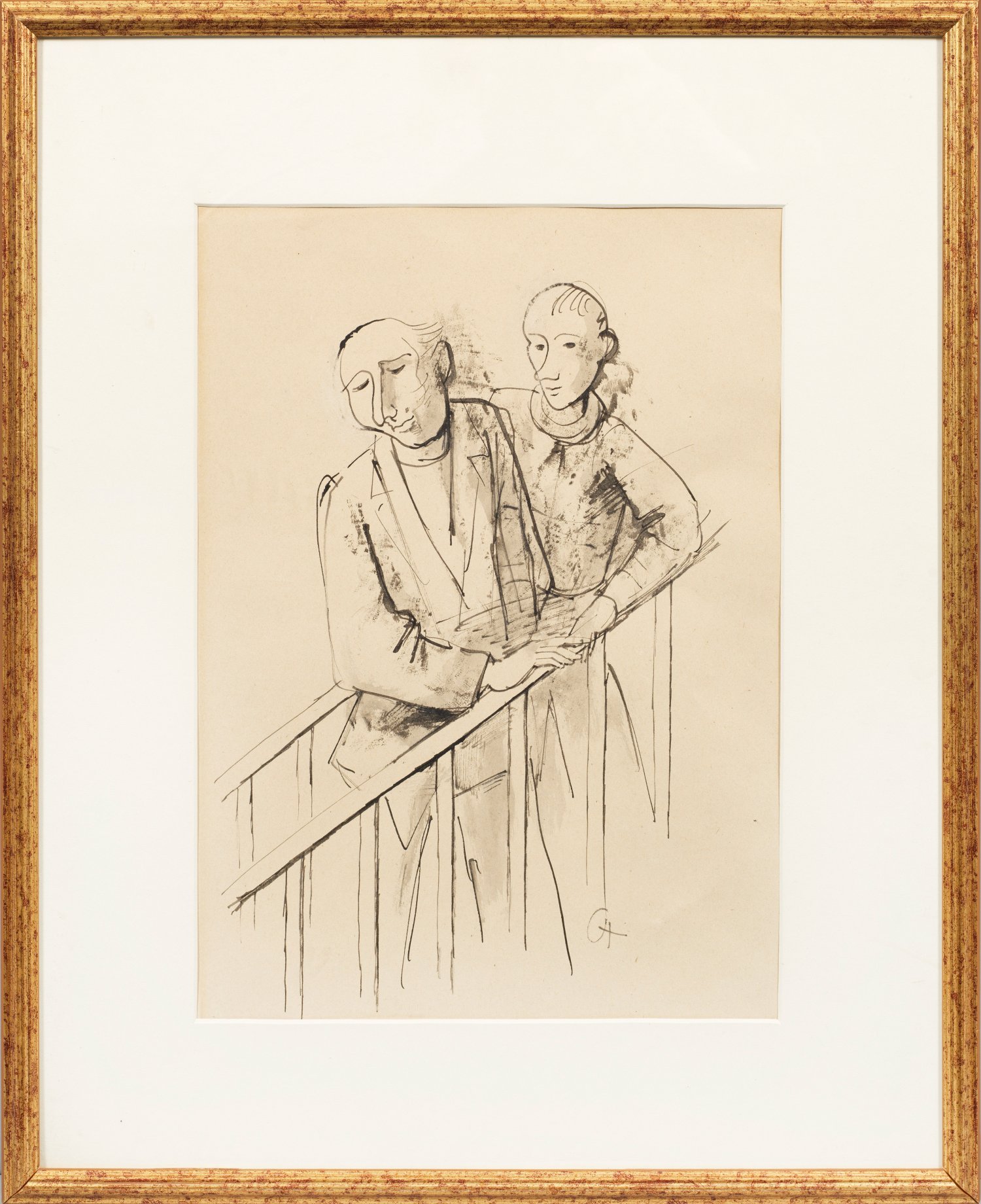 Um 1945-1947 entstandenes Blatt Hofers, der in jenen Jahren mehrfach Figuren auf Treppen schilderte. Dargestellt ist ein älterer Mann, der in enger Beziehung dicht neben einem jüngeren Mann steht, verbunden durch übereinander gelegte Hände. Außer dem Lebensalter- und Freundschaftsmotiv ist es auch als Vater-Sohn-Beziehung interpretierbar, zugleich als Hommage an das berühmte Gemälde "Bauhaustreppe" von Oskar Schlemmer aus dem Jahr 1932; Schlemmer war 1933 zusammen mit Hofer als Lehrer an den Vereinigten Staatsschulen für freie und angewandte Kunst in Berlin entlassen worden. Im "Dritten Reich" wurden Hofers Werke als "entartet" verfemt, er selbst wurde 1938 aus der Preußischen Akademie der Künste ausgeschlossen. Nach der Befreiung mit dem Kriegsende übernahm Hofer 1945 das Direktorat an der Hochschule für Bildende Künste in Berlin. Die Bedeutung Hofers liegt in seinem persönlichen, sensiblen, allgemeingültigen Menschenbild fern von jeglichem Pathos. Feder u. lavierte Tusche/Papier. R. u. Ligaturmonogr. "CH". 50 cm x 35 cm. Rahmen.