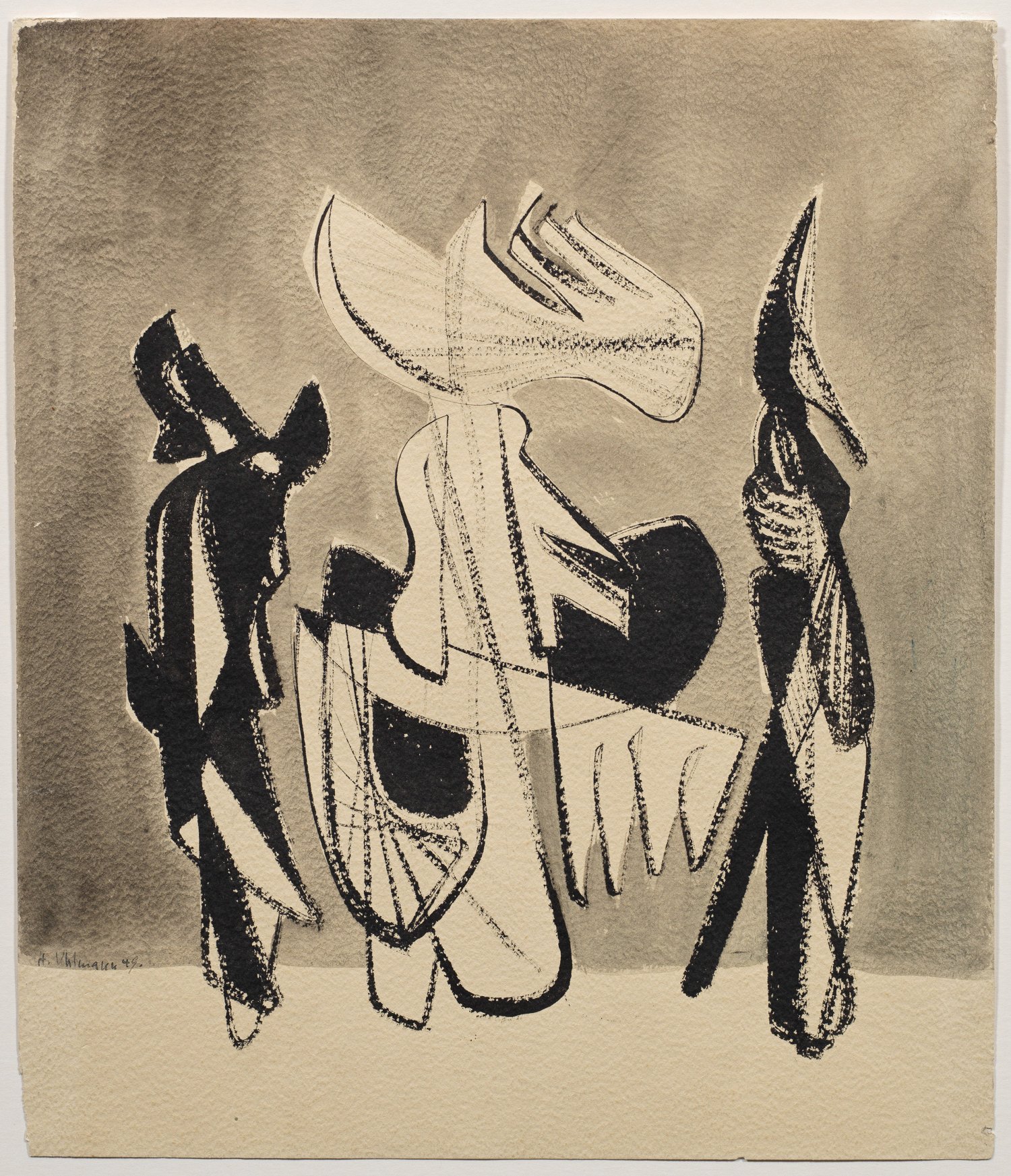 Abstrahierte, konstruktivistisch angelegte, aus fließenden Formen aufgebaute Figuren, die dem Betrachter in ihrem Zusammenspiel Bewegung vermitteln. Charakteristische Komposition Uhlmanns, der Maschinenbau und Bildhauerei studierte und 1926-1933 an der Technischen Universität in Berlin lehrte. Aus dieser Zeit stammen seine ersten geometrischen Köpfe, die er 1930 in der Galerie Fritz Gurlitt in Berlin ausstellte. 1933 wurde er aufgrund der Teilnahme an einer antifaschistischen Flugblattaktion für zwei Jahre inhaftiert und fortan als "entartet" verfemt. 1950 folgte er seinem Ruf als Professor für Bildhauerei an die Hochschule der Künste in Berlin. Uhlmanns Arbeiten wirkten sich ab 1945 stilbildend in Deutschland aus und viele seiner konstruktivistischen Metallplastiken befinden sich im öffentlichen Raum. Tusche und Aquarell/Bütten. L. u. sign. und dat. (19)49. Wvz. Thiele 435. Rückseitig blauer Sammlungsstempel Dr. Michael Semff. Blatt 42 cm x 36 cm.