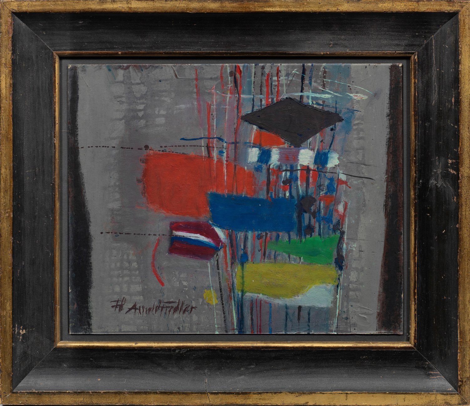 Rhythmische Komposition aus intensiv farbigen Linien und Flächen. Fiedler gehörte als Künstler des expressiven Realismus zu den Wegbereitern der abstrakten Kunst in Hamburg. Ab Anfang der 1950er Jahre beschäftigte er sich mit dem Informel. 1959-1969 in Paris ansässig, näherte Fiedler sich dem französischen Tachismus an. Öl/Malkarton. L. u. sign.; 33 cm x 41 cm.
