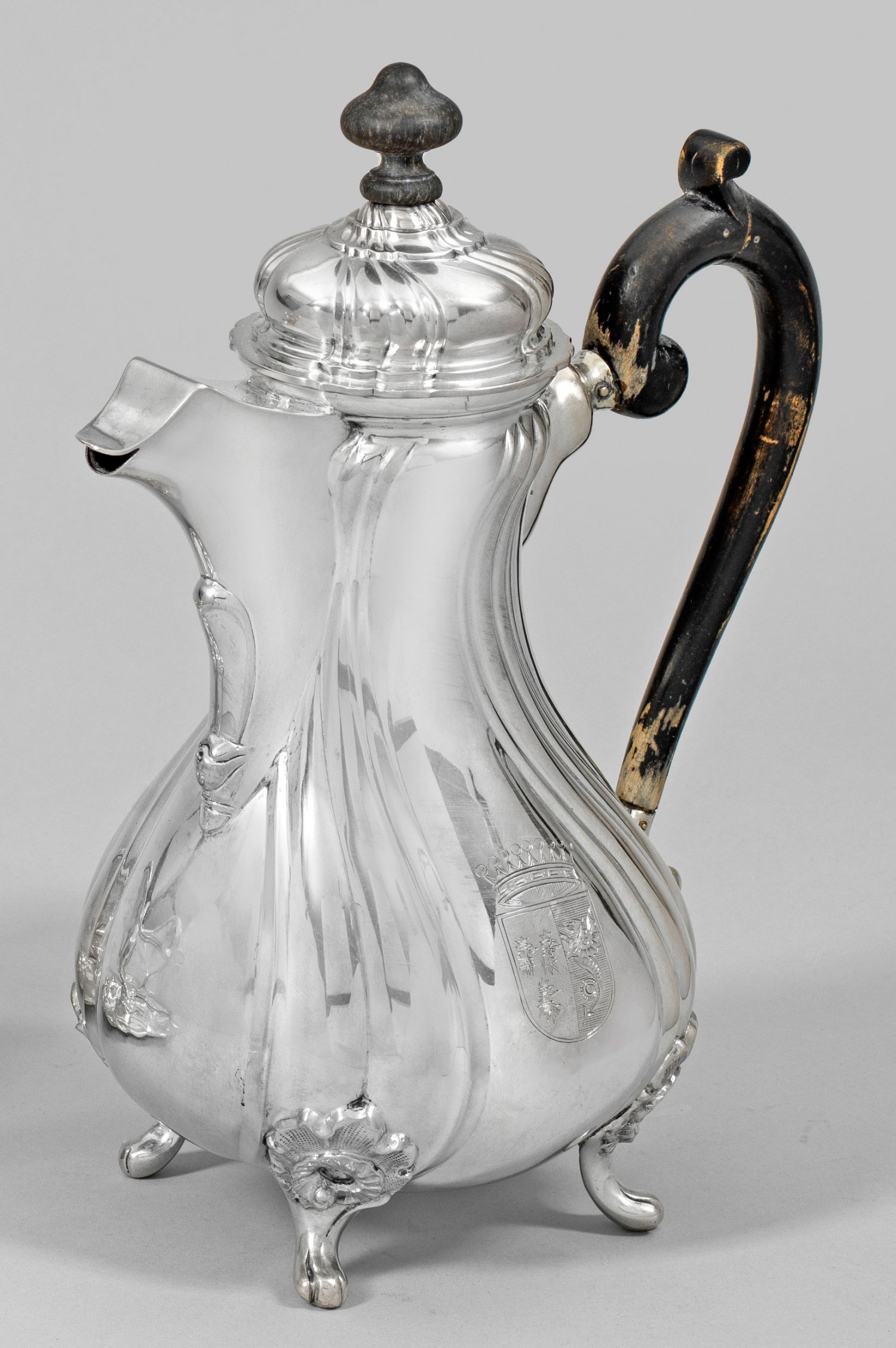 Silber. Über vier stilisierten Füßen, am Ansatz mit reliefplastischen Rocaillen verziert, birnförmiger Korpus mit mittig angesetztem, stark ausgeprägtem, teilw. abgedecktem Konsolausguss. Haubenartiger Scharnierdeckel und seitlicher Ohrenhenkel aus ebonisiertem Holz. Wandung umlaufend gegliedert durch passig geschweifte, leicht in sich gedrehte Züge. Schauseitig graviertes Allianzwappen der Grafen von Rothkirch und Trach. Gest. 750, Herstellerzeichen. Gew. ca. 755 g. H. 27,5 cm.