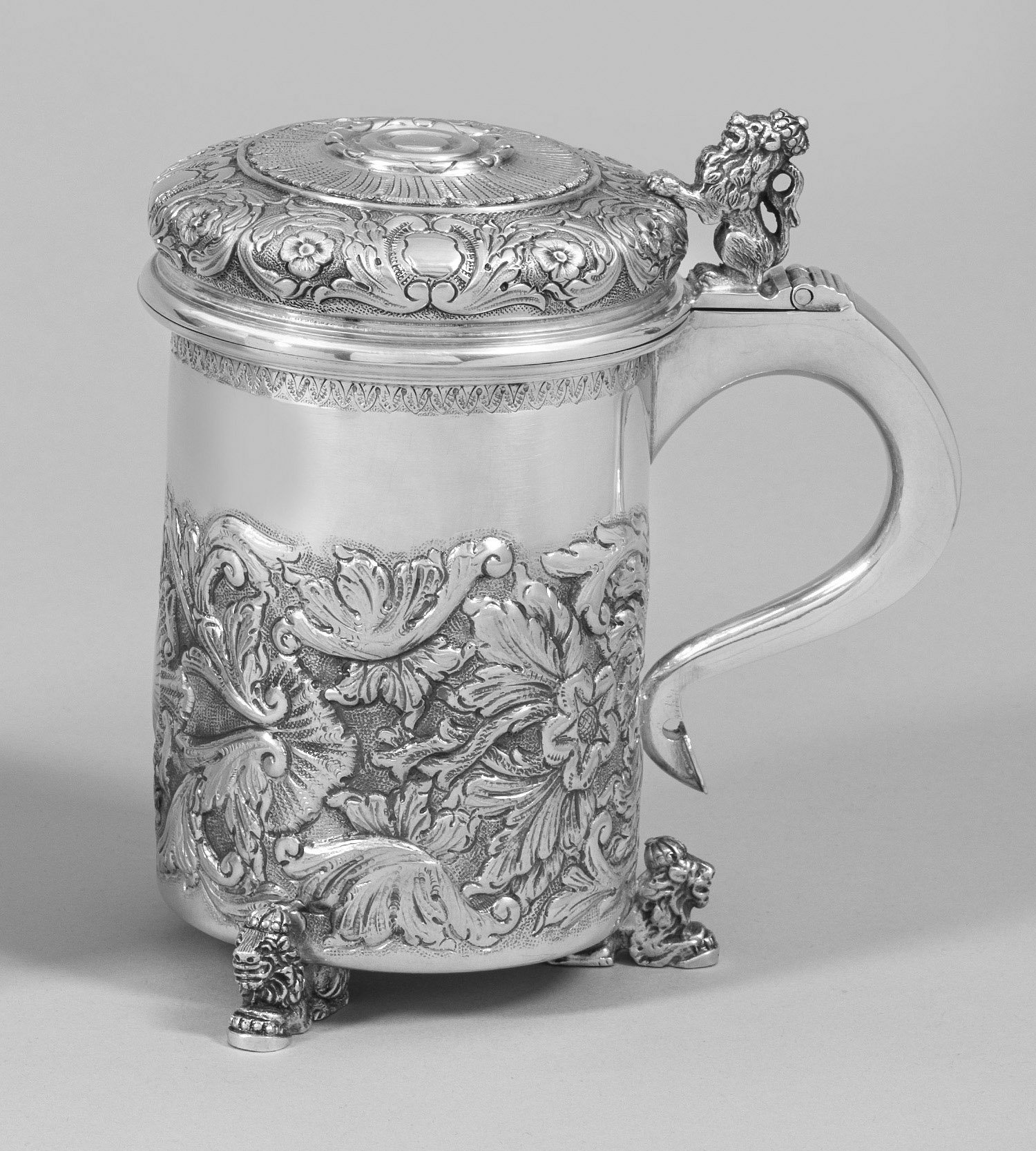 Silber. Von drei Füßen in Form von plastischen, liegenden und bekrönten Löwen getragener zylindrischer Korpus mit gewölbtem Scharnierdeckel. Als Daumenrast ein weiterer bekrönter, sitzender Löwe. Glatte Randzone, übergehend in Ohrenhenkel. Wandung und Deckel verziert mit üppigem Akanthusblattdekor, Rocaillen, Blüten und Muschelwerk über punziertem Grund. Unterhalb des gering ausgestellten Lippenrandes zart gravierter Lorbeerblattfries. Schauseitige ovale Kartusche. Gest. 835 sowie "P.V.". Gew. ca. 735 g. H. 17,5 cm.