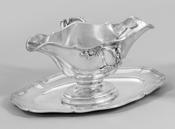 Silber. Über ovaler, montierter und randprofilierter Unterschale gering gebauchter, schiffchenförmiger Korpus mit weit ausgezogenen, seitlichen Ausgüssen sowie zwei durchbrochen gearbeiteten, zweigeteilten Ohrenhenkeln aus plastischen Voluten und Blattranken. Auf der Unterschale ein graviertes Wappen. Gest., Beschauzeichen, Meister Augustin Lahure (tätig seit 1886). Gew. ca. 595 g. H. 11 cm. 25 cm x 17 cm.
