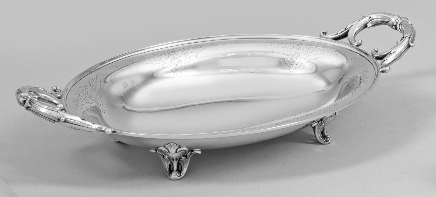 Silber. Längliche, ovale Form. Über vier volutierten, mit Akanthusblättern verzierten Füßen, zart gemuldete, glatte Schale mit seitlich zwei durchbrochen gearbeiteten Volutenhenkeln. Der Rand umzogen von graviertem Bandelwerkdekor. Gest. 800. Gew. ca. 415 g. H. 7,5 cm. 36,5 cm x 22 cm.