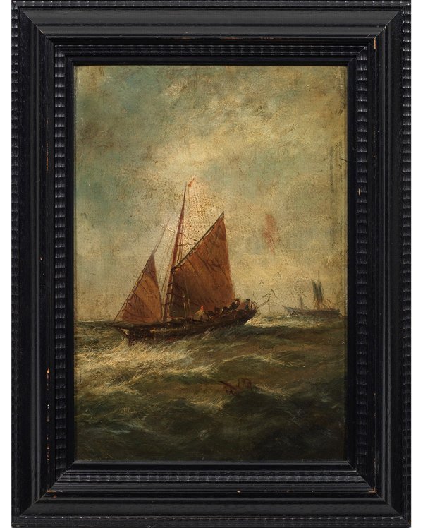 Vor einer grauen Wolkenwand kämpft sich ein Fischerboot durch die wogende See, im Hintergrund ein weiteres Segelschiff. In gedeckten Farben gemaltes Seestück in der Tradition der niederländischen Marinemalerei des ausgehenden 19. Jahrhunderts. Öl/Malkarton. 43 cm x 30 cm. Rahmen.