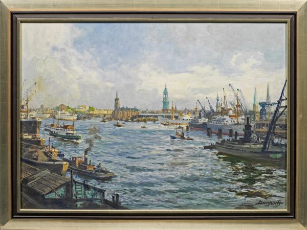 Hafenansicht mit Blick gen Michel und Kehrwiederspitze. Öl/Lwd.; R. u. sign.; Verso Original-Etikett der Galerie Commeter, Hamburg, mit Betitelung und Künstler-Bez.; 70 cm x 100 cm. Rahmen.