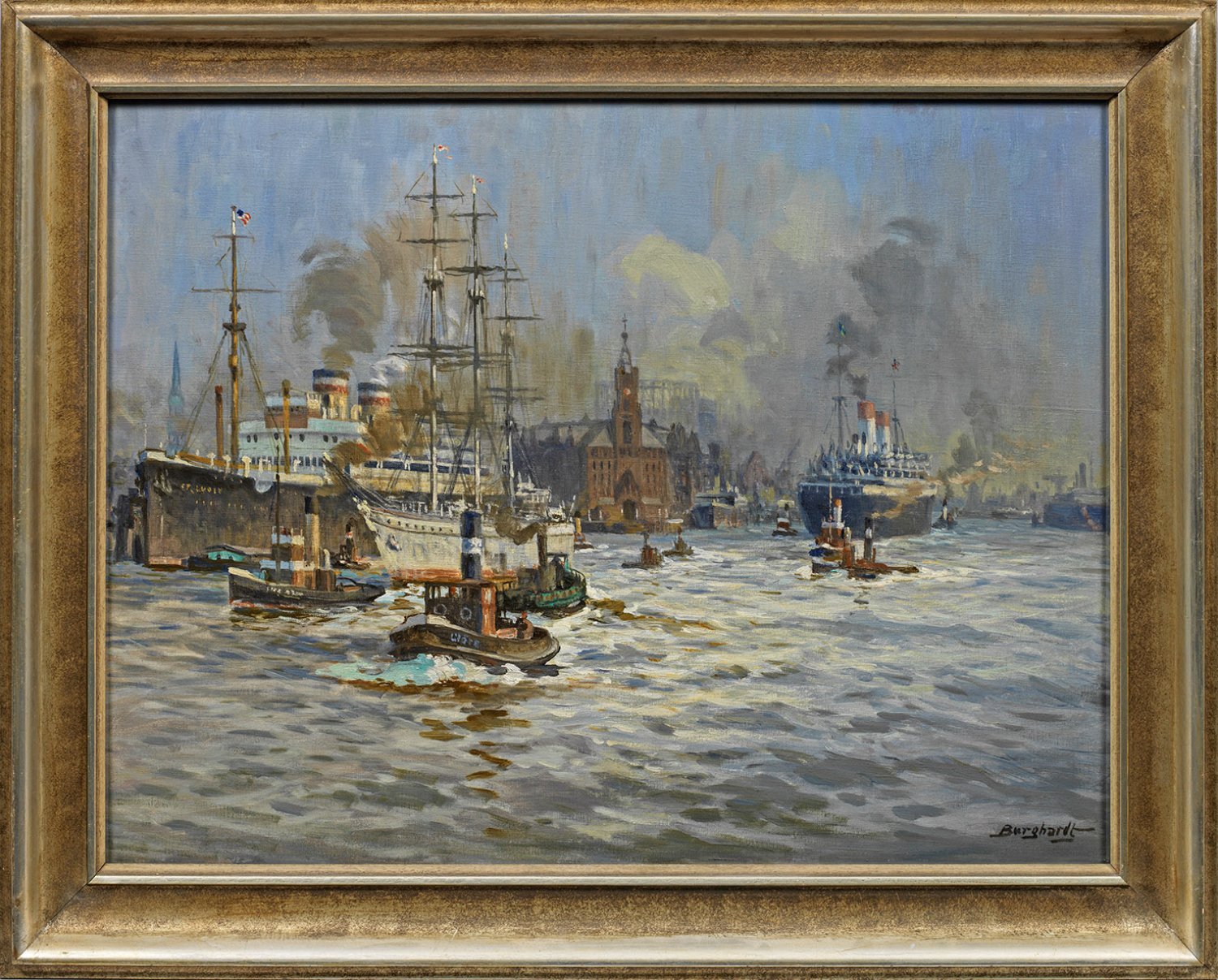 Belebte Elbansicht mit Großsegler vor der Kehrwiederspitze. Öl/Lwd.; R. u. sign.; Verso Original-Etikett der Galerie Commeter, Hamburg, mit Betitelung u. Künstler-Bez.; 60,5 cm x 80,5 cm. Rahmen.