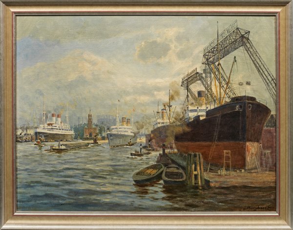 Schiffsdarstellung im Werftgelände mit Blick über den stark frequentierten Hafen und die Kehrwiederspitze. Öl/Lwd.; R. u. sign.; Verso Original-Etikett der Galerie Commeter, Hamburg, mit Betitelung u. Künstler-Bez.; 60 cm x 80,5 cm. Rahmen.